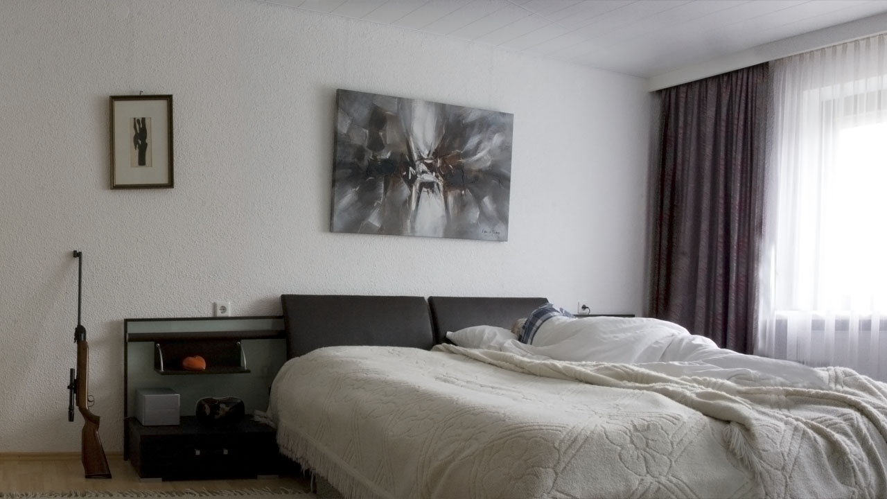 Will there be peace in our lives sometime? Eine Türklingel schlägt an, hinter dem Glas sieht man schemenhaft die Silhouette einer Frau. Niemand öffnet. Raum um Raum wird abgetastet. Ein Glasschrank, naturbelassene Holzvertäfelungen, rustikales Mobiliar, eine Schusswaffe lehnt an der Wand neben einem Doppelbett. Das Telefon klingelt. Niemand hebt ab. Milchig-weiße eisige Behaglichkeit.
