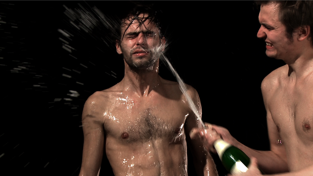 Lifeshow RMX resembles a music video intended for MTV. Men’s bodies sprayed with Champagne dance in listless celebration to a mellow house number. Soap bubbles fly through the air, fields of neon color blink in the background, firecrackers go off. The video reverses stereotyped gender roles and ironizes the pop industry’s oversexualized methods of representation.