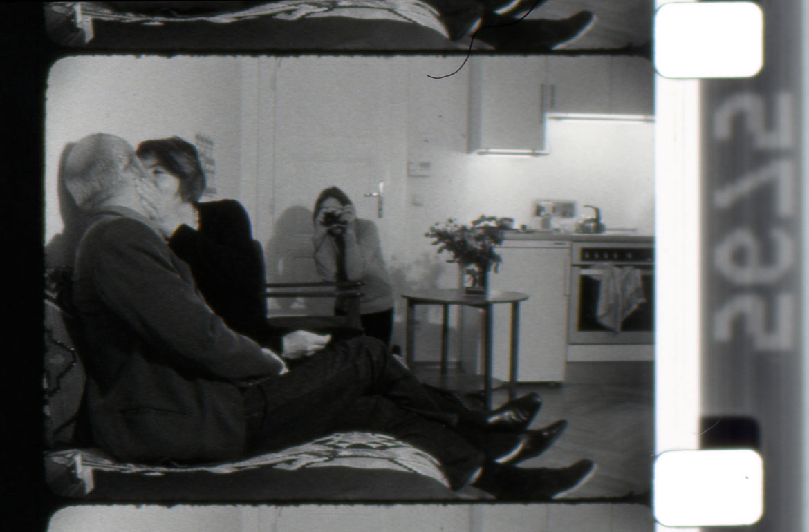 Grainy 16mm film. An older couple on the couch. Someone handles an analog single lens reflex camera in the background: Photo session. The originally domineering discomfort of the subjects who are recorded twice soon turns into mischievous laughter - the man is affectionately surprised by a kiss. The atmosphere seems instantaneous, very personable, and almost intimate. This is possibly Friedl vom Gröller´s most prominent trademark.