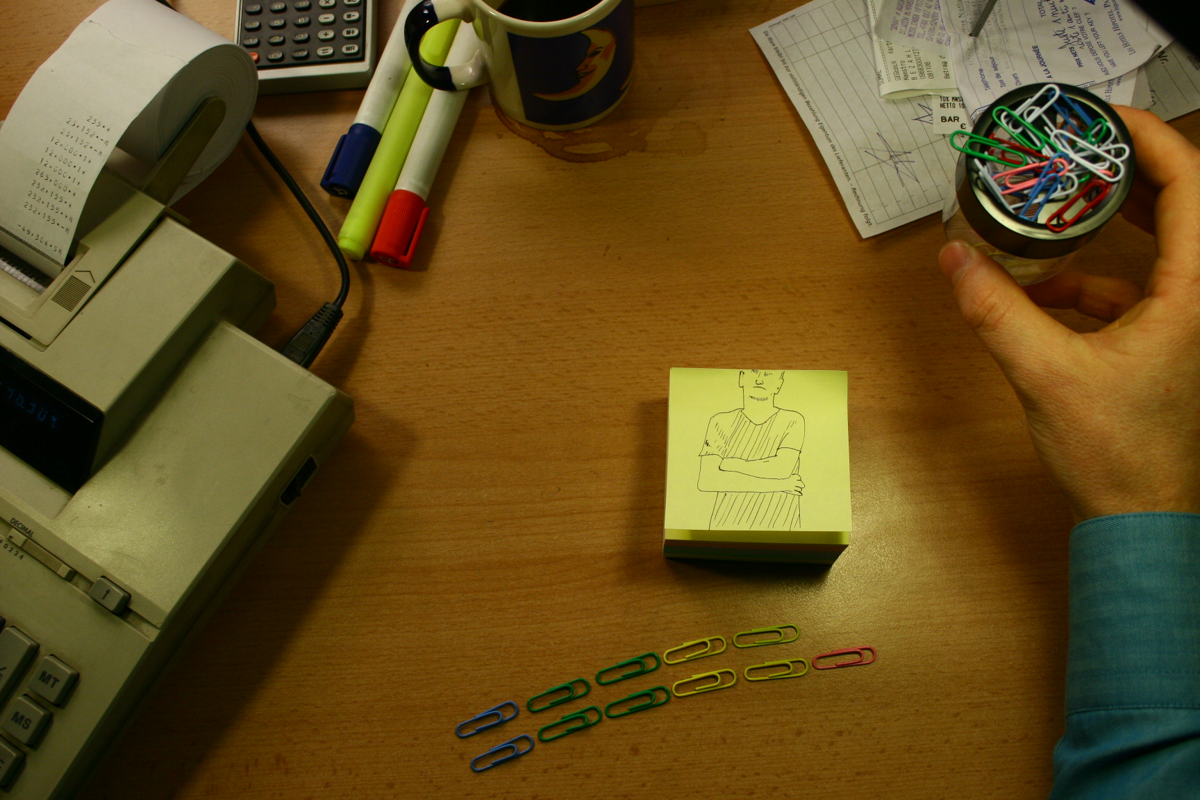 Perfect stop-motion animation, "location", the desk. The singer Karl Schwamberger (Laokoongruppe) performs as an animated figure on a stack of post-its, as the lyrics to Walzerkönig roll past on a till roll. Alongside there is a video within a video, a train journey drawn with a highlighter, and from time to time the director reveals himself – grabbing his coffee cup, or remodeling the film set as a miniature home disco. (production note)