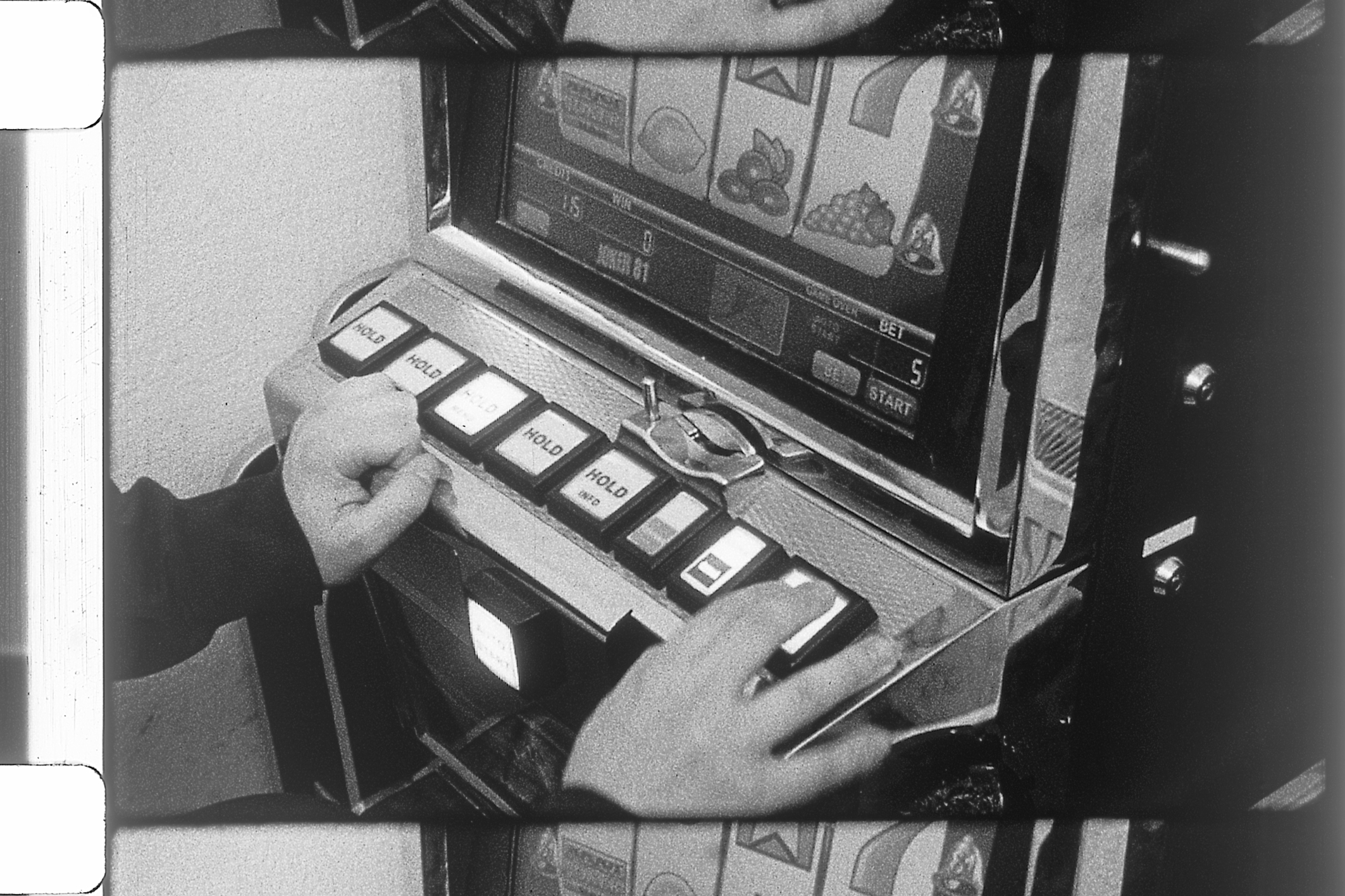 A man, woman and child sit in a car. He parks it, walks a short distance, enters a gaming hall and heads straight for a machine. The woman and child remain in the car, are bored while he tries his luck. The camera zeroes in on details at the modest casino: a lamp, a loudspeaker, worn walls and chairs, slot machines blinking away. A few men sit by themselves in the main room. We catch sight of a number on the digital display; it has two decimal digits, is as cryptic as the Dow Jones and comprehensible only to those in the know. The man has since switched to a different machine, a closeup of his hand shows it monotonously pressing the same start button. He has moved up from coins to banknotes. Using the reduction typical of his work, Josef Dabernig successfully creates a drama that suggests the three individuals´ loneliness and emptiness. Each of them stoically plays his or her part, presumably hoping for an improvement of their financial situation, though the child has no choice. While the interior and exterior of the spaces serve as additional protagonists, they fail to provide a dramatic climax in their everyday provincial character either.