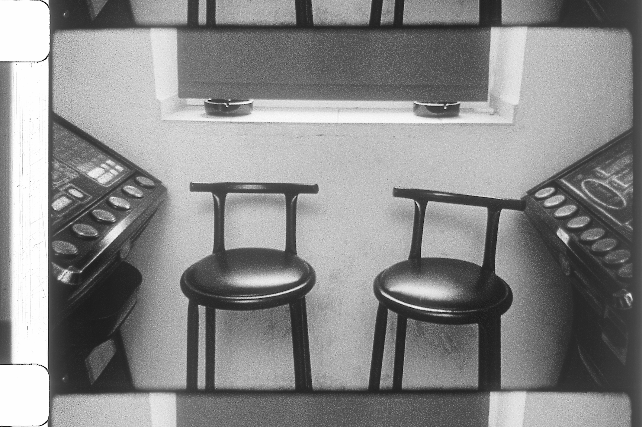 In Herna, image and sound are in disorder. The young protagonist is taking his chances at slot machines in a game bar (herna in Czech) in a gloomy Moravian town, in the obvious hope of becoming rich and, certainly, quitting its drab location, while the aged caricatured personages of a radio play (written by Bruno Pellandini) in a Viennese cafe, over some serious Slivovitz. They are prating about real and imaginary fortunes, castles, and chic hotels, lost by some, won by others, always in an extraordinary set of circumstances. At some point characters start to recite in rhyme, carrying the tone to the point of operetta-like inebriated absurdity.