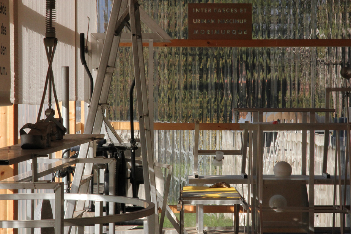 Rather than ingenious poses, as one knows all too well from other artists’ portraits, here one hears only Kolig’s voice and sees signs and words that the artist has installed in and around the complex. At one point, Kolig calls for “using the brain like an ax or a chainsaw against language.” In direct reference to this deconstructivist approach, Pirker continually focuses on his transparent objects in her pulsative succession of images; but also on those structures of permeable architecture (passageways, windows, Plexiglas panes, etc.) that are indebted to the building complex’s ability to transform rather than its fixation.