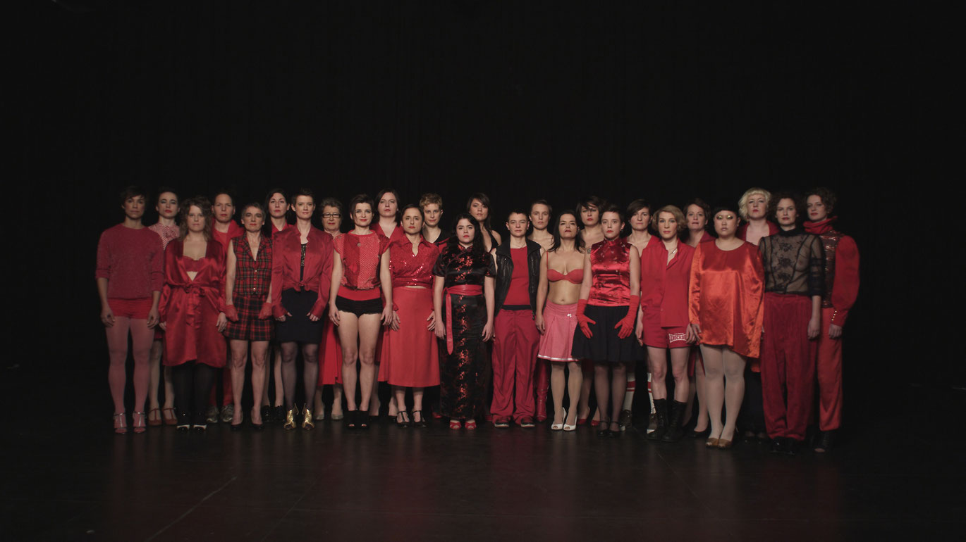 A coquette stripper flirts with an upper-class lady. A dressage rider jumps into a quasi-pornographic ménage à trois with two women playing a horse. A disc adorned with a spiral and a throwing knife rotates in a sea of confetti. And a silent, laughing, cheering and kissing lesbian-queer choir surround the trilogy. In the context of post-porn strategies and the neo-burlesque movement, captured (also) by queers and feminists, for whom the plurality and performativity of body images and forms of desire are central, the Vienna-based artist and Otto-Mauer prize laureate Katrina Daschner crosses the heterosexist gaze with an obvious, classical vocabulary of temptation. When the burlesque performer in the first part HAFENPERLEN (HARBOR PEARLS) smilingly calls up the traditional gestures of an erotic tease, thereby referencing an Egyptian film of the 1940s in which the singer and dancer Naima Akef embodies both the belly dancer as well as the captain flirting with her, her smile is no longer that of an available object. On the contrary, the knowing grin, directly addressed to the camera, together with the complicit winking between the stripper and the observing lady (both played by Daschner), creates a distance from the glamorous and stylish, almost sterile staging of the events, at the same time commenting on the fantasm, as well as the liberating laughter of the lesbian chorus at the end. Also in the second and third parts, ARIA DE MUSTANG and FLAMING FLAMINGOS, which allude to recurring motifs in film and theater history with calculated dramatical effects and queer musical undertones by the Kumbia Queers, Bonanza Jellybean and Edita Gruberová, the sensuous self-determination stands at the core, which through the plurality of the chorus, appearing at times androgenous, at times opulent in red drag, comments with a wink of the eye, before finally embedding in a powerful collective.