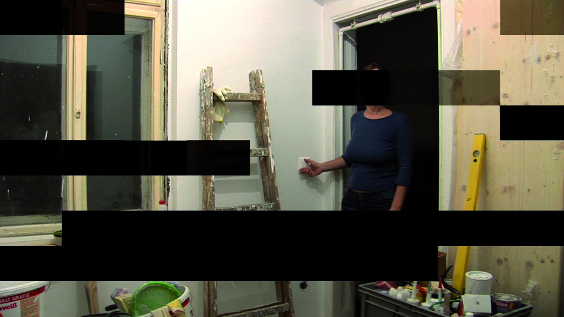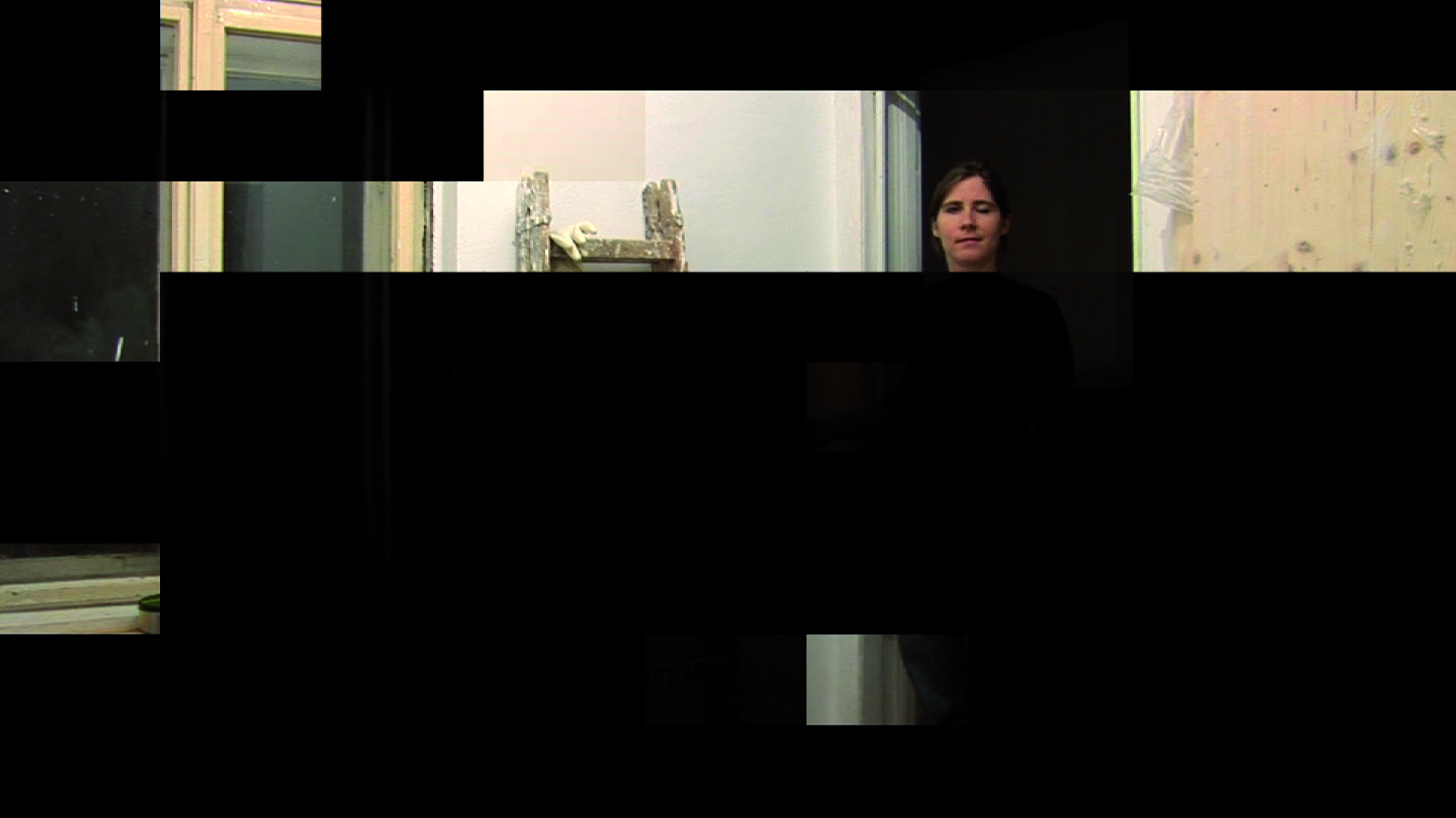 She has divided the picture of her video into a regular grid. At the beginning the spectator is shown nothing more than blackness, and the game begins when the ceiling lamp is switched on. After that one section of the picture after another lights up and then goes dark again, from left to right and from top to bottom.