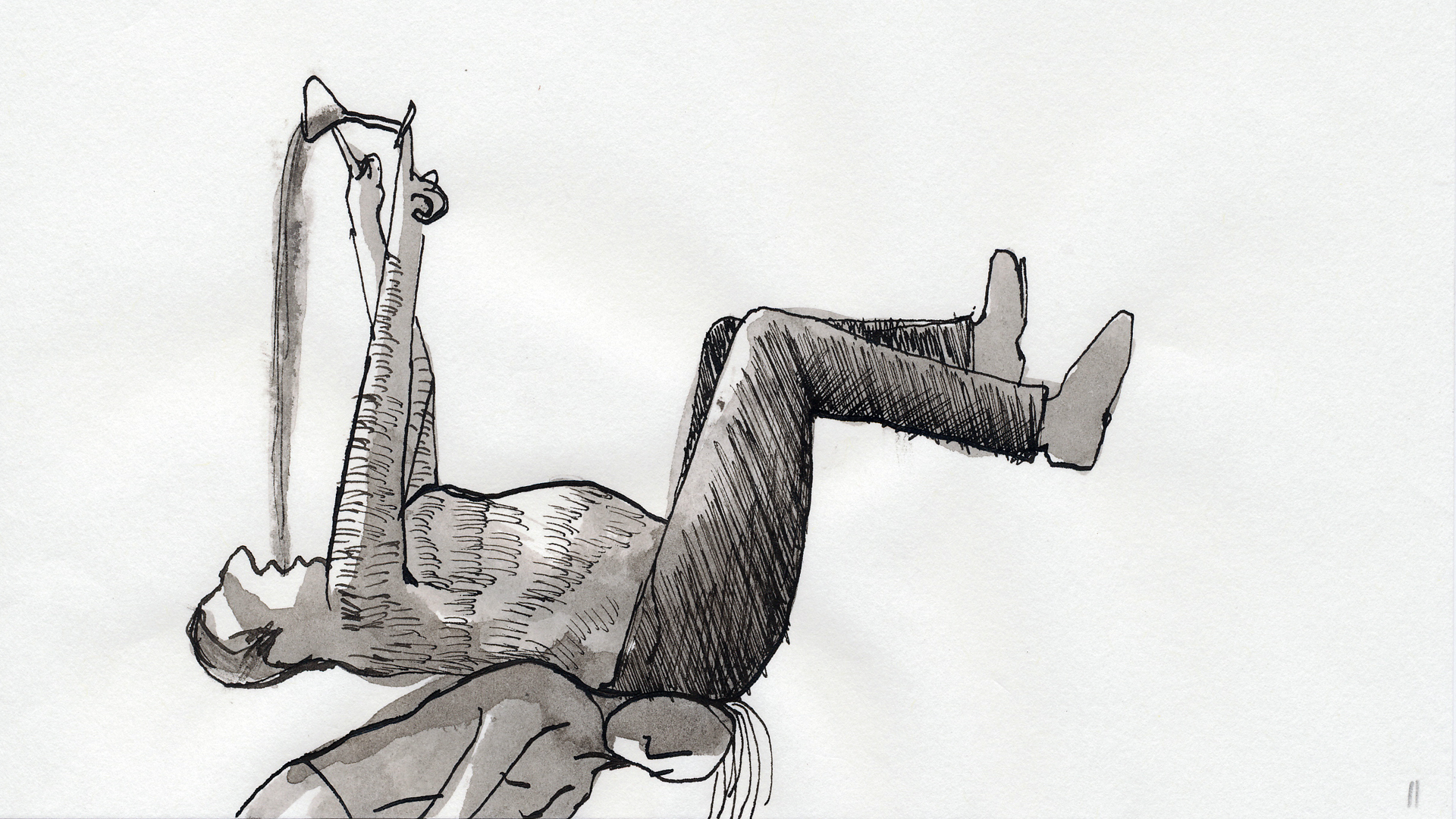 “A journey like a chase.” After having just met, a young woman and her local companion take a car trip in Georgia. There is laughter, dancing, and drinking. But without warning, the casual atmosphere constantly switches with a tense scenario: An anthropomorphous owl appears to cling to the protagonist like a shadow, a second person, and engage in a subliminal conflict with her companion. The characters carry out both play and the fight by means of animated choreography: man, woman, and bird-creature embrace, threaten, and repel one another while also simultaneously attracting each other. Arendt´s affinity to dance and performative means of expression is shown here: “… because a great deal is transported through the movement, which cannot necessarily be shown in a still or in a fixed pose (Janina Arendt 2010). The minimal visual level results in additional concentration on the protagonists´ interplay. The black-and-white cartoon animation drawn with an ink pen is heavily stylized. There are no backgrounds and not even all essential objects in the plot are fully sketched out. The bird as a metaphorical figure already played a role in Arendt´s early work. Whereas it had clearly positive connotations in Wibbel-ich&Glück (2007) and initiates the protagonist´s liberating transformation, the owl in An Owl´s Zest & Quirks oscillates—similar to its mythological significance in various cultures—between constructive and destructive symbol. The woman is able to ultimately gain the upper hand in the battles on this associative, animated journey. She triumphs over her alter ego, the owl-creature, wins the game, and flies away with a sigh of relief.