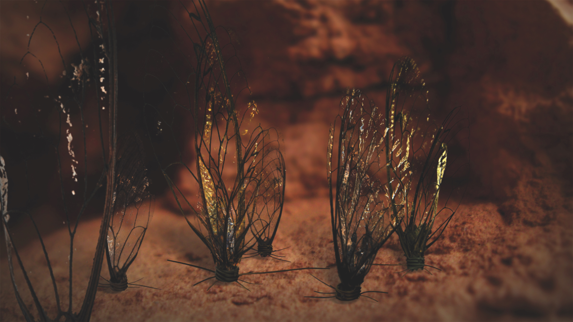 Hybrids composed of discarded refuse, insect wings, bones, hair and plant particles germinate within the nooks and crannies of rocks, tree hollows and cactus beds. Creeping, crawling and oozing, these organic-synthetic mutants multiply and evolve, luring the viewer deep into an inner sub-cosmos. In this micro-universe the metamorphosis intensifies, until the gaze is released into the innocent daylight again.