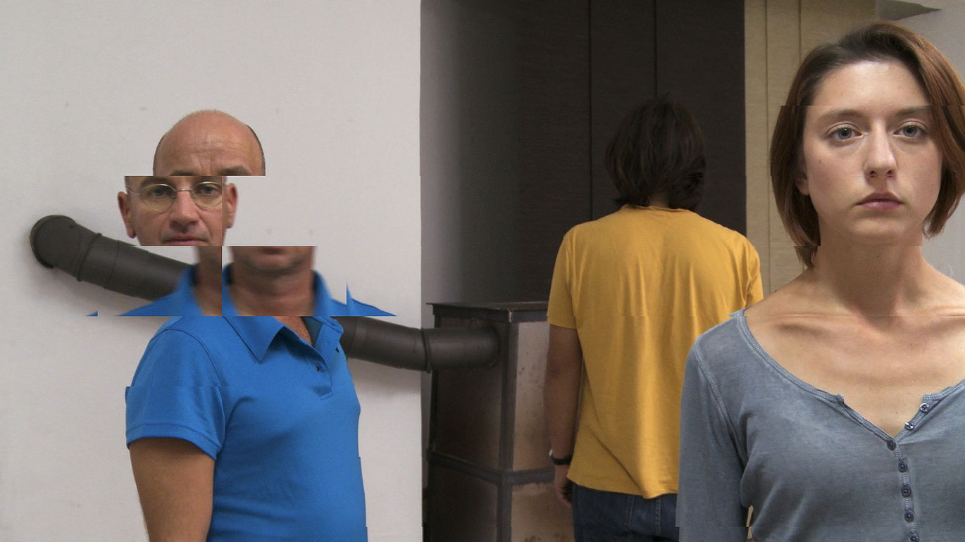 By means of the apparatus´ measuring, which horizontally and vertically rasterizes the space, the cinematic space, normally defined by a central-perspective, suddenly becomes a flat, partially abstract image space. The camera seems to have developed a life of its own. It is interested equally in room plants, floor lamp, and ceiling light; but is erratic and generates what are occasionally quite strange effects: horrent hair, trembling leaves, a “fat lip”. The four performers remain practically motionless in this scenario, this experiment, until they simply leave in the end. (Claudia Slanar)