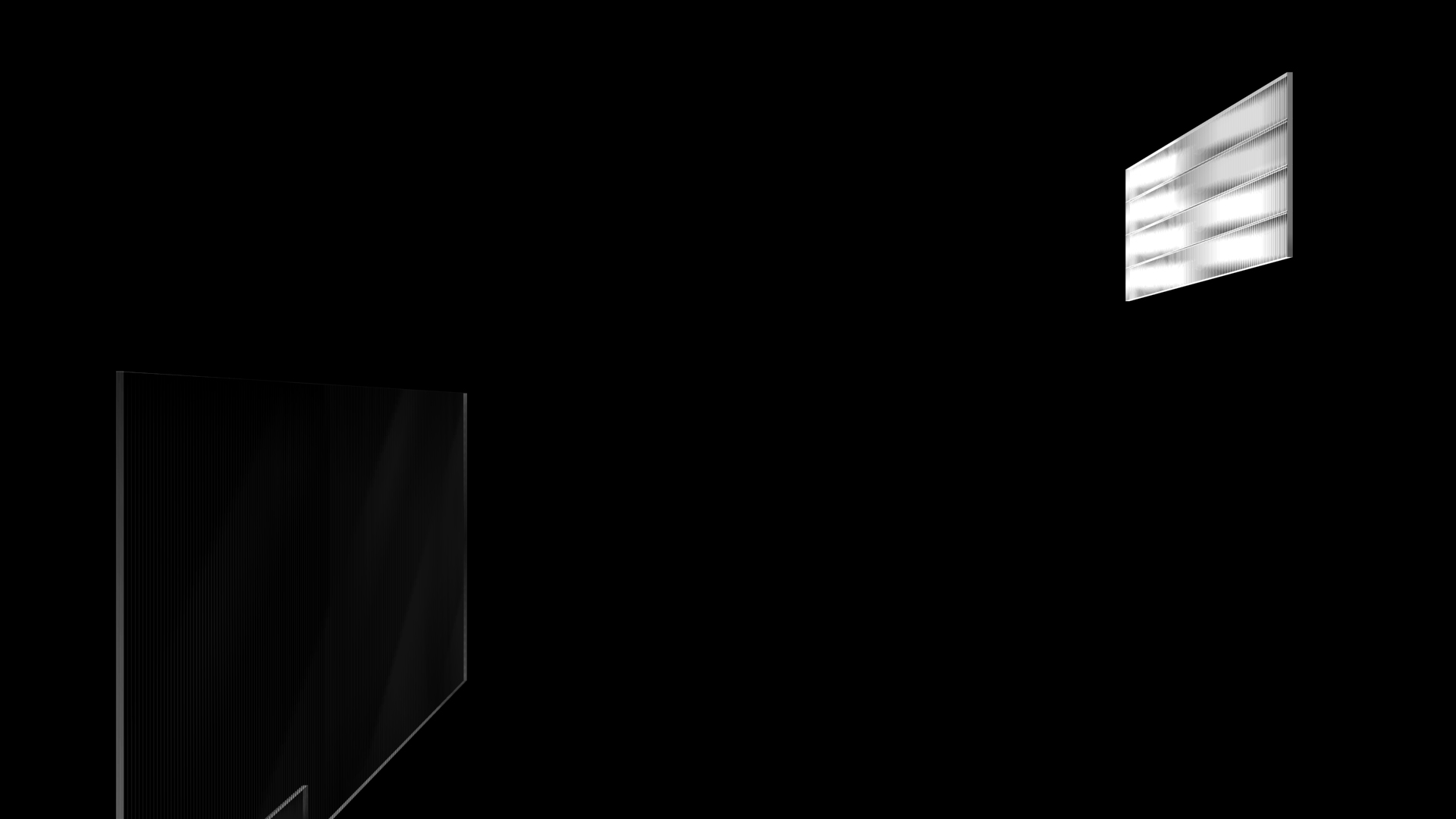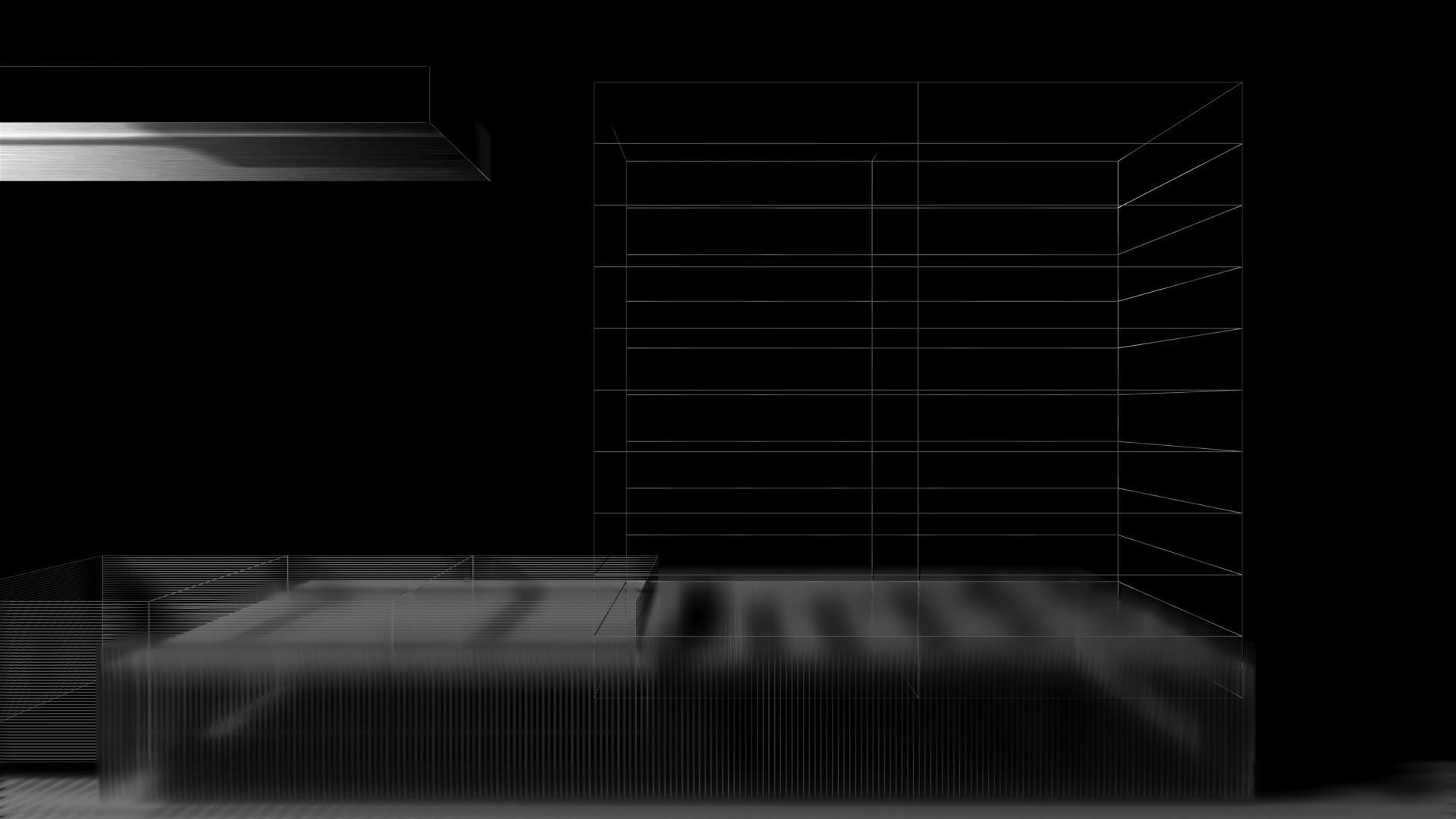With the light-dark contrasts and light courses, Manuel Knapp brings, in addition, cinematic elements into the game: for example, the complex visual development is disturbed, in part, by diffuse shadows, transparencies, and also reflections, which fracture the potential precision of the linear, computer-generated structures.