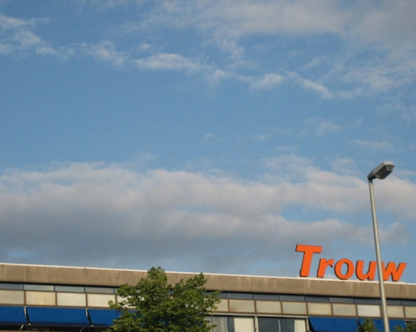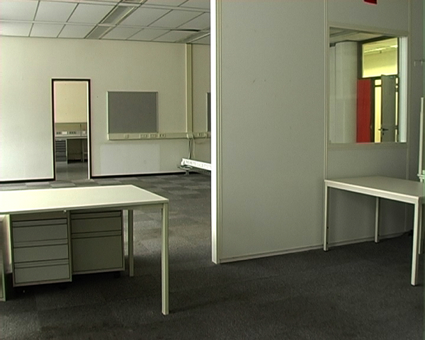 The close proximity of the publishing houses to one another, their originally divergent political leanings, their contemporary appearance, as well as their shared fate as industrial ruins with changing subsequent uses form the basis for Krautgasser’s work. Also in a literal sense, as the artist’s studio during her stipend was situated on the fourth floor of the former Volkskrant building, with a view of the complex opposite, which had been used by the newspaper Trouw until 2003. The artist’s approach to the object is nevertheless deliberately distanced. She does not embark on a subjective “search for traces” that could do nothing else than to read from the items, she finds what it is that she had previously put into them. Instead, the trained architect analyses the three buildings “structurally” by bringing more inconspicuous areas like lifts, corridors, foyers, office spaces, waiting areas, or production complexes into view in a precise succession of sparse stills and brief film sequences, and making them comparable with one another. Apart from a few design details, it is primarily the large newspaper mastheads on the façades that allow the locations shown to be ascribed to the appropriate building.