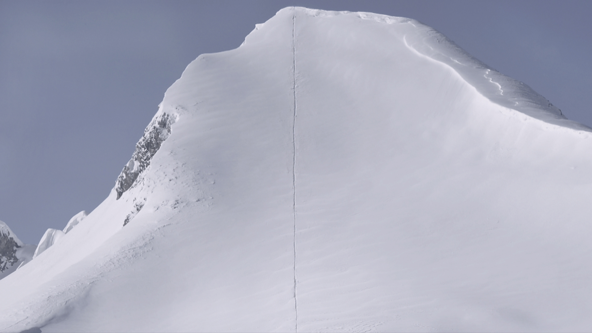 The waft of sublimity is suddenly broken by a black splotch on the upper edge of the snow formation. But this is no landed mountain jackdaw; instead, a snowboarder coming from the backside of the peak, getting into position. Now he races in a tuck down the steep slope, to then disappear from the lower edge of the picture around fifteen seconds later.