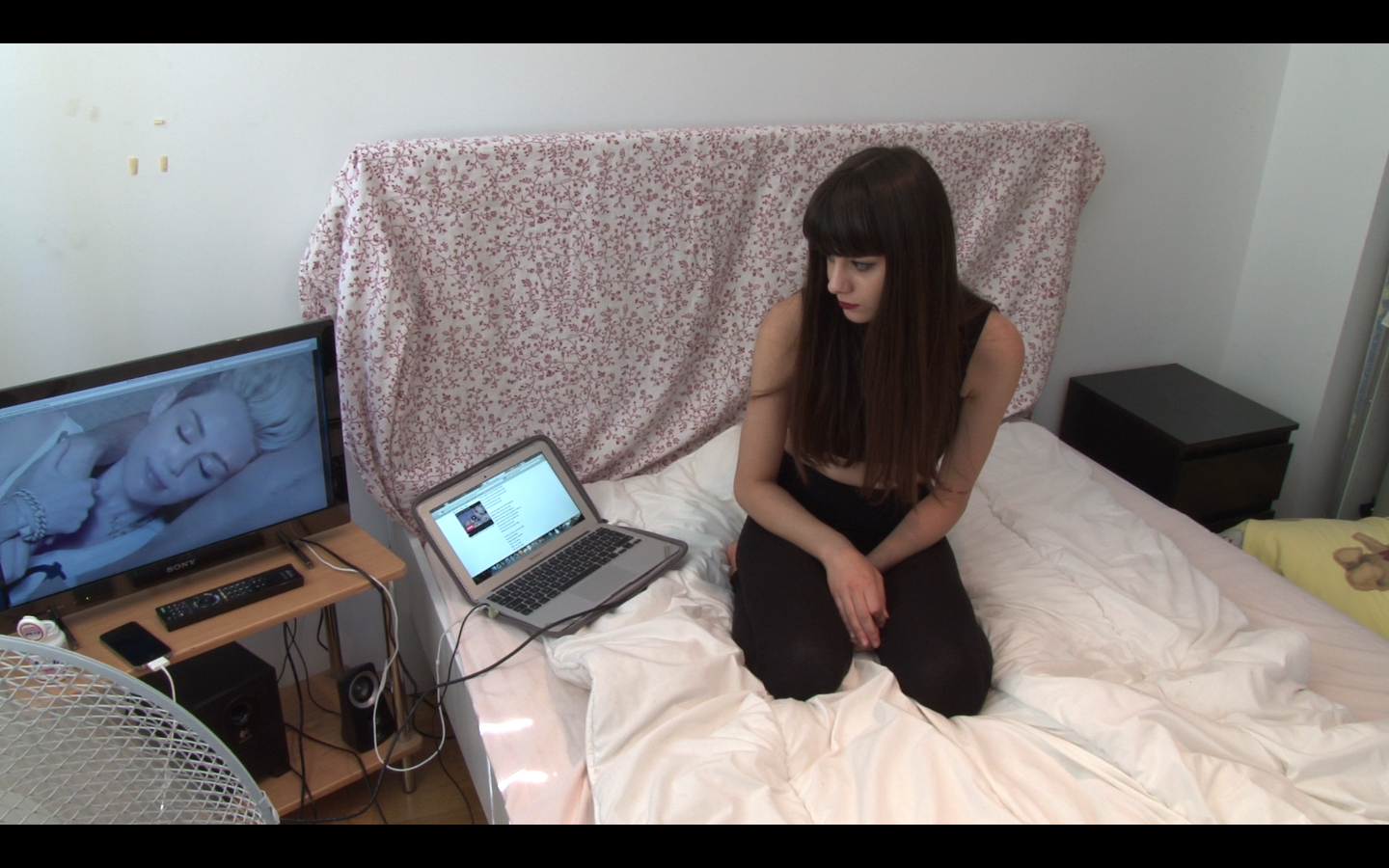 The background story for sexy is worked out on a huge flat-screen television. Mega pop star Miley Cyrus’s music video “We Can’t Stop” is playing, which the artist Kurdwin Ayub watches, copies, and ultimately also interprets. Like the singer, she, too, lolls about in a skin-tight fitness suit that stops above her belly, imitates the movements of copulation on the sheet, and shakes her butt from time to time. The amateur and the professional on the screen embody the youthful vamp.