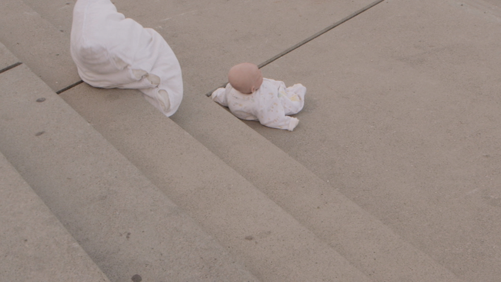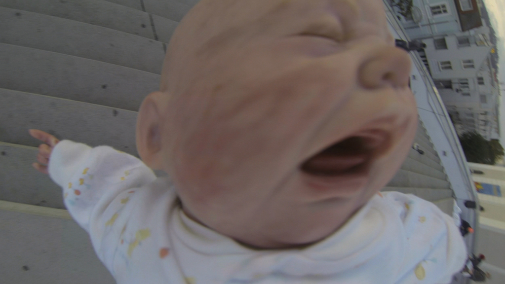 Now, when Norbert Pfaffenbichler subjects this baby stroller crash down the steps to an Odessa Crash Test, the freeing potential of this fury is first realized untainted by didactic (Eisenstein), dramatic (De Palma) or comic (Nielsen) intentions. His mad stroller ride down the steps is constructed as a sensational stylistic staccato, which seems to casually grotesquely exaggerate the drama and comedy of the situation—the speed of the takes changes just as rapidly as their sizes, formats, and perspectives. Thanks to the wheel-axle camera, the events and images literally rush into one another. The soundtrack switches continually, to twitch between speed rush and slow motion suspense, from thunderous musical melodrama to lurching baby stroller sizzle to breathless silence—which takes the upper hand when the climax arrives that Eisenstein did not dare to show: how the baby is catapulted from the stroller and set soaring in flight, which is appropriately absurdly savored—until the inevitable impact. Odessa Test Crash: a smashing success.
