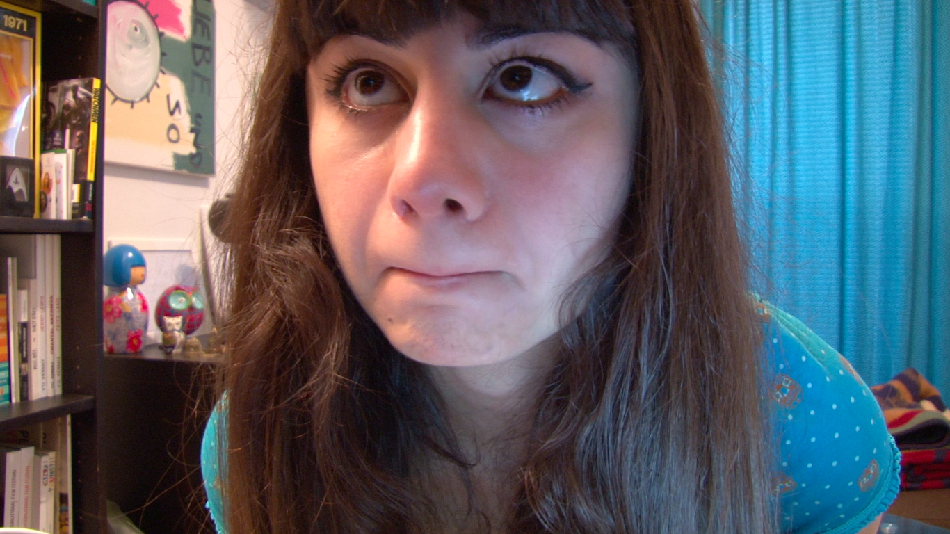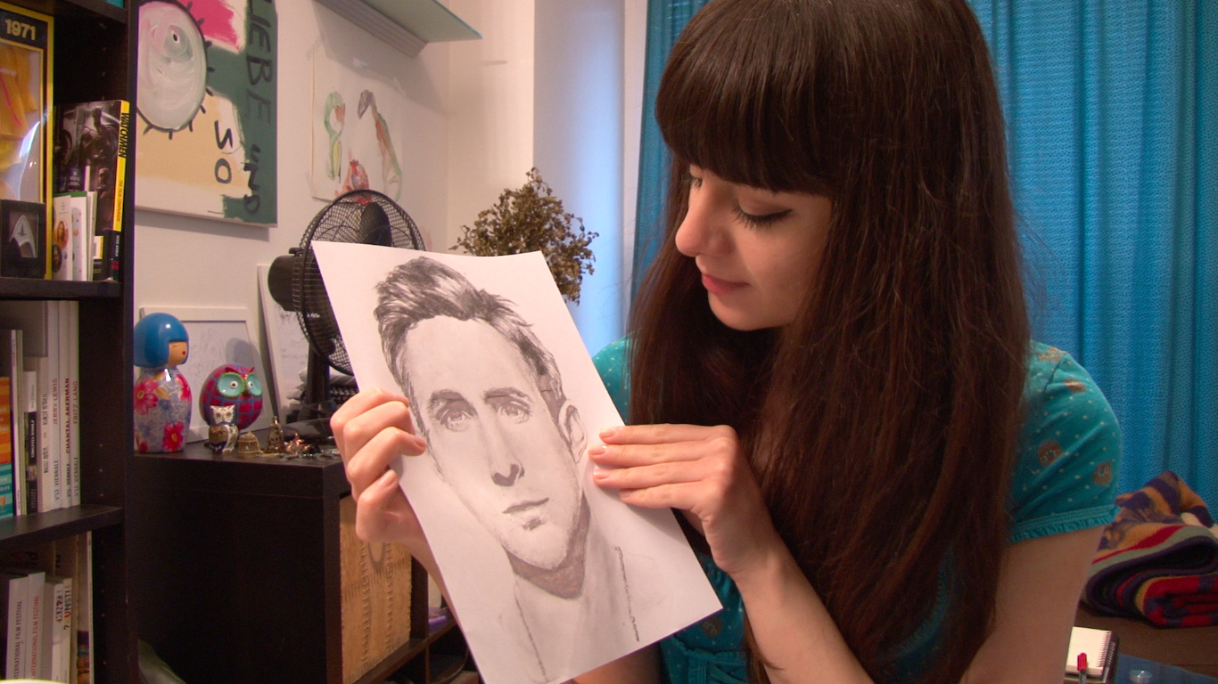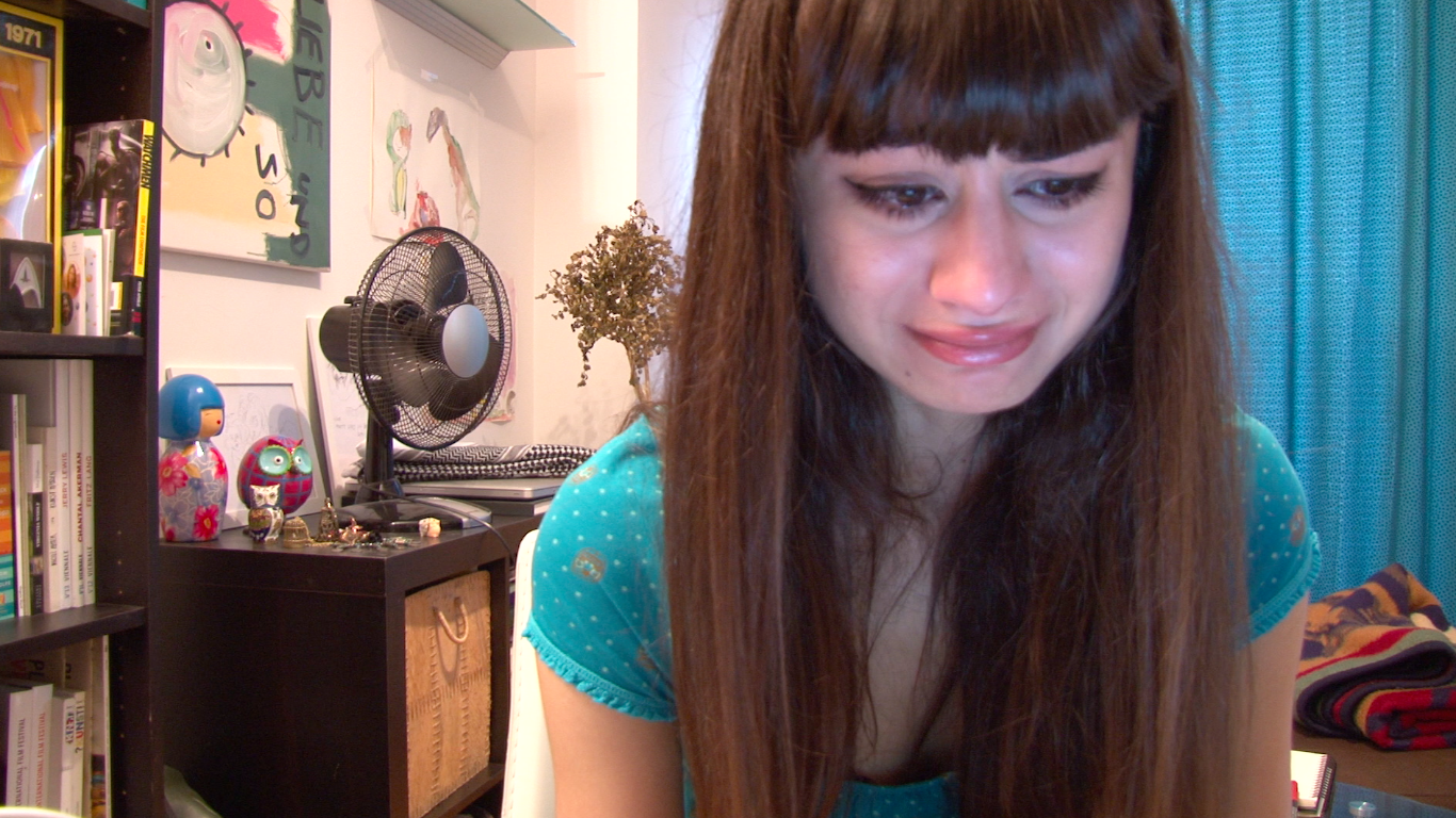 A girl posts a new video blog entry. She wants to show her new Ryan Gosling drawing. The whole time she’s in a funk and doesn’t really want to go on. She starts listening to music and awkwardly crying, stops crying and in a totally bad mood, goes back to doing the video blog, like she was at the beginning. (Kurdwin Ayub)