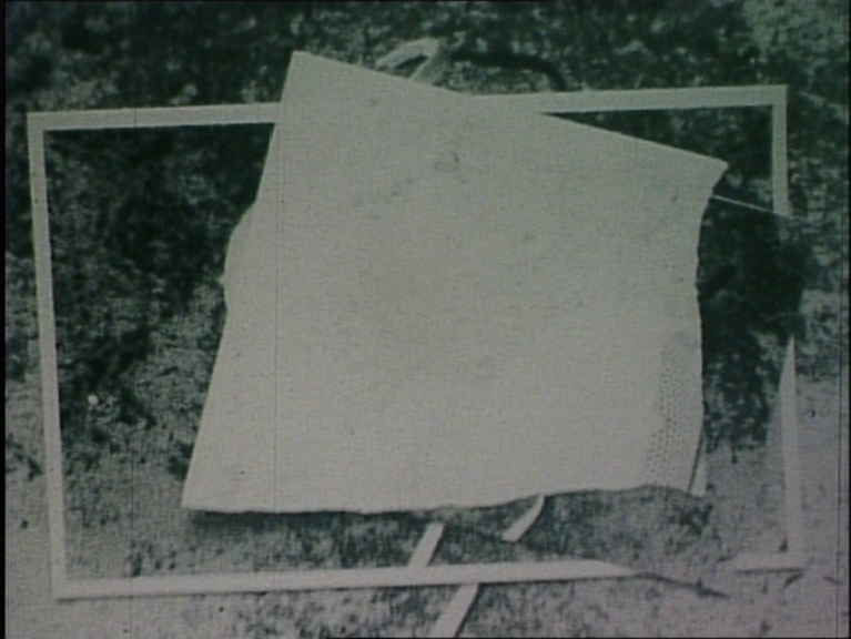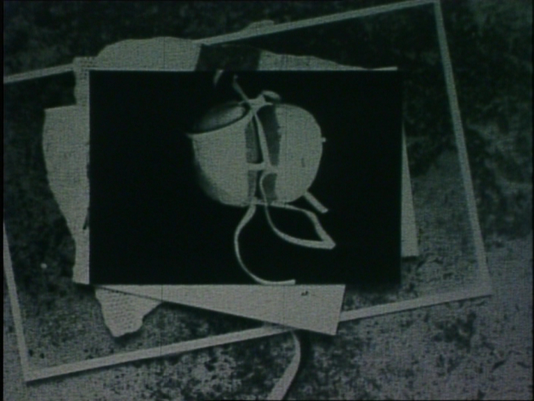 Photos of the white linen ball are laid on top of one another and varied, three consecutive times, separated by black leader. The rolling of a wooden ball can be heard simultaneously.