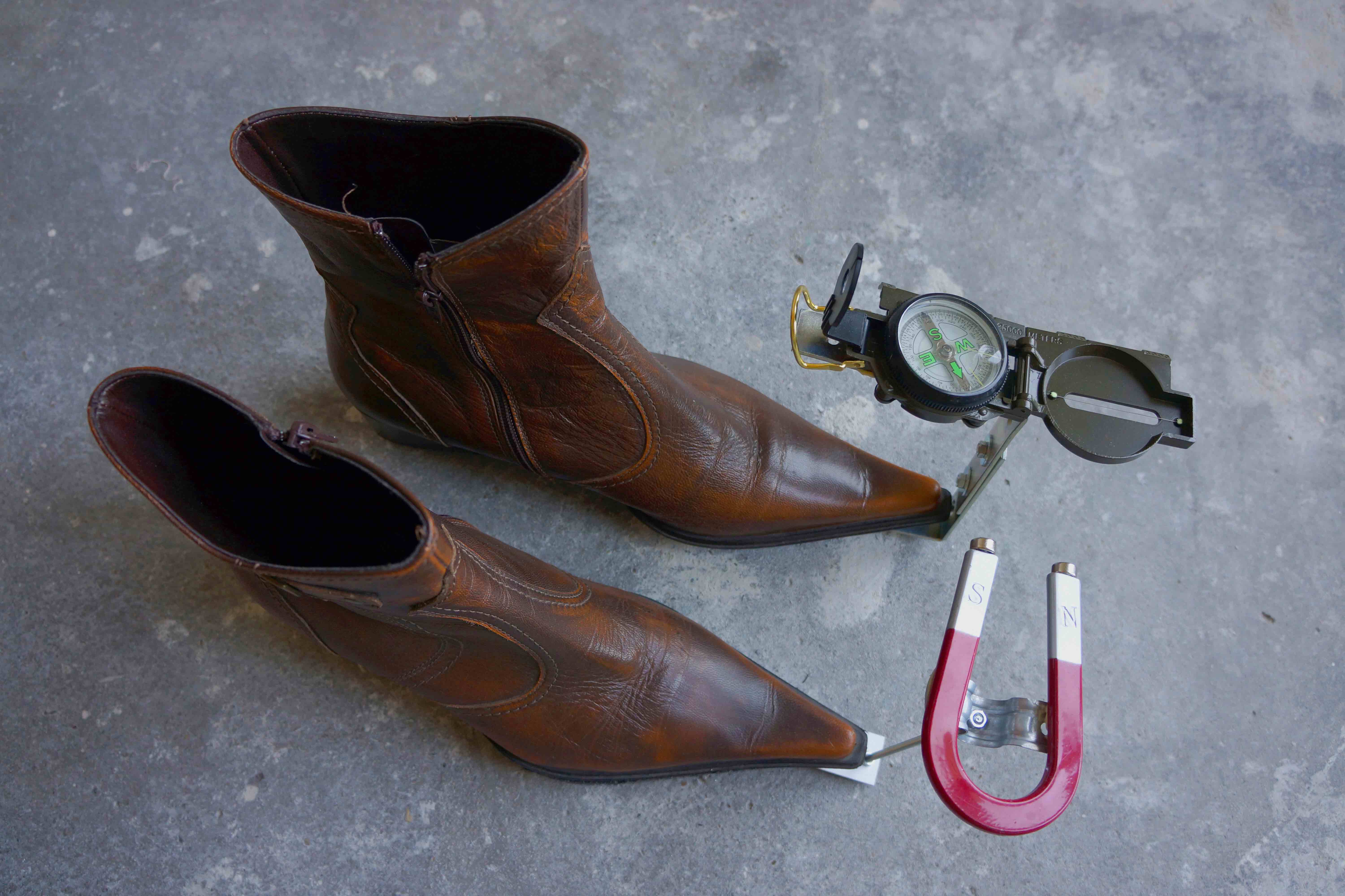 Alongside word play and more basic, everyday situations, Vasof uses the shoes she has designed to "film" more complex associations. The words "step" and "approved" are stamped out by the heels of a pair of stilettos, while a rear-view mirror mounted on cowboy boots reveals the vanity of the person wearing them and his passion for cars.