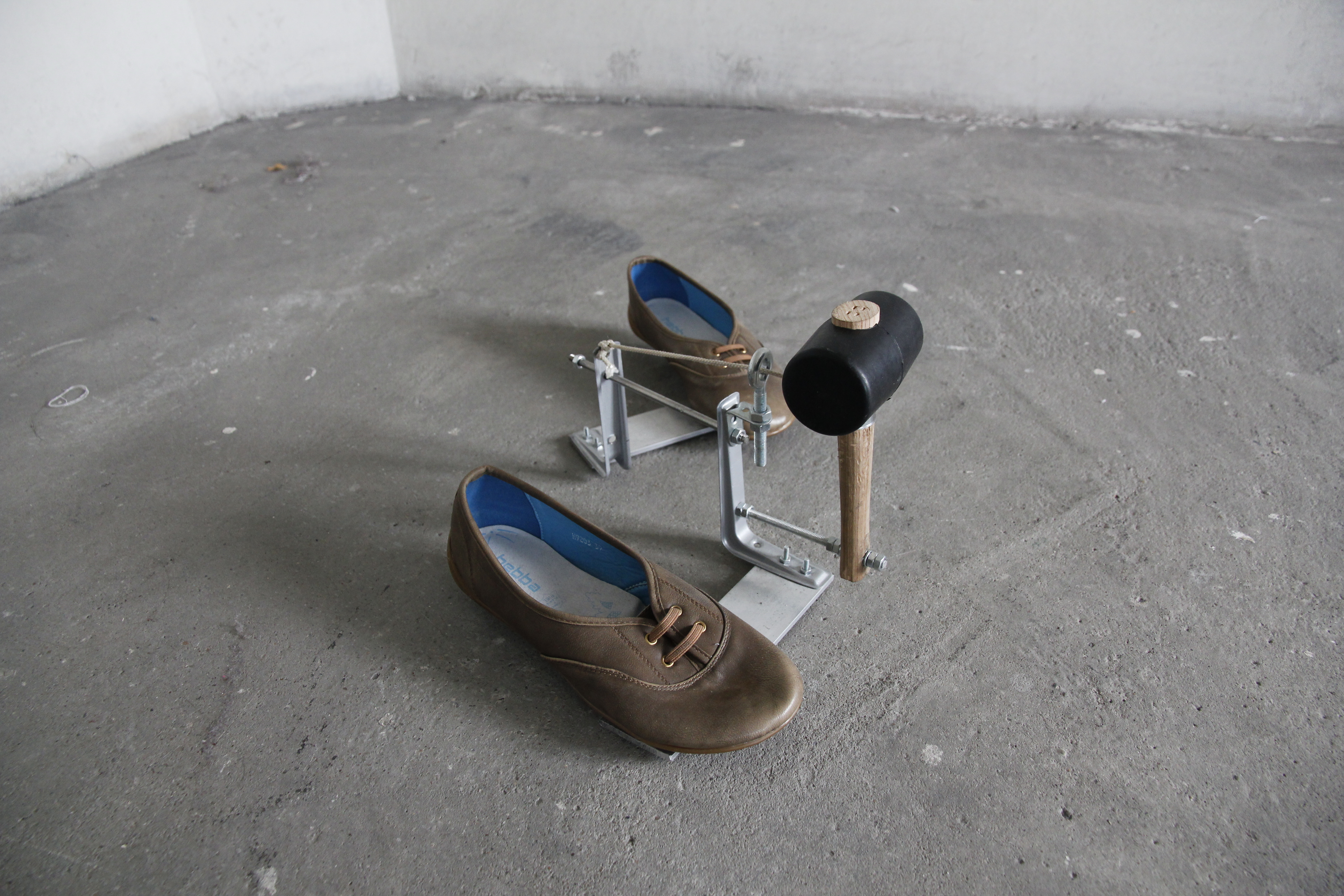 In Down to Earth, Anna Vasof refers to this multifunctional significance while putting a very particular spin on the concept of "footwear". After all, the artist fabricated highly distinctive mechanical devices for each of her 28 shoe designs, some of which set entire stories in motion upon walking.