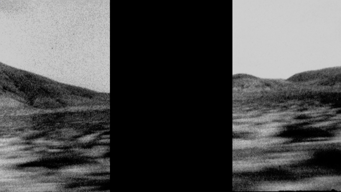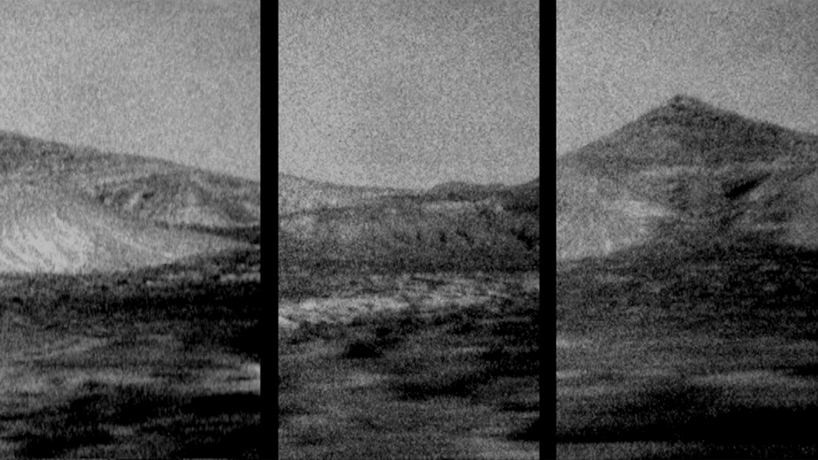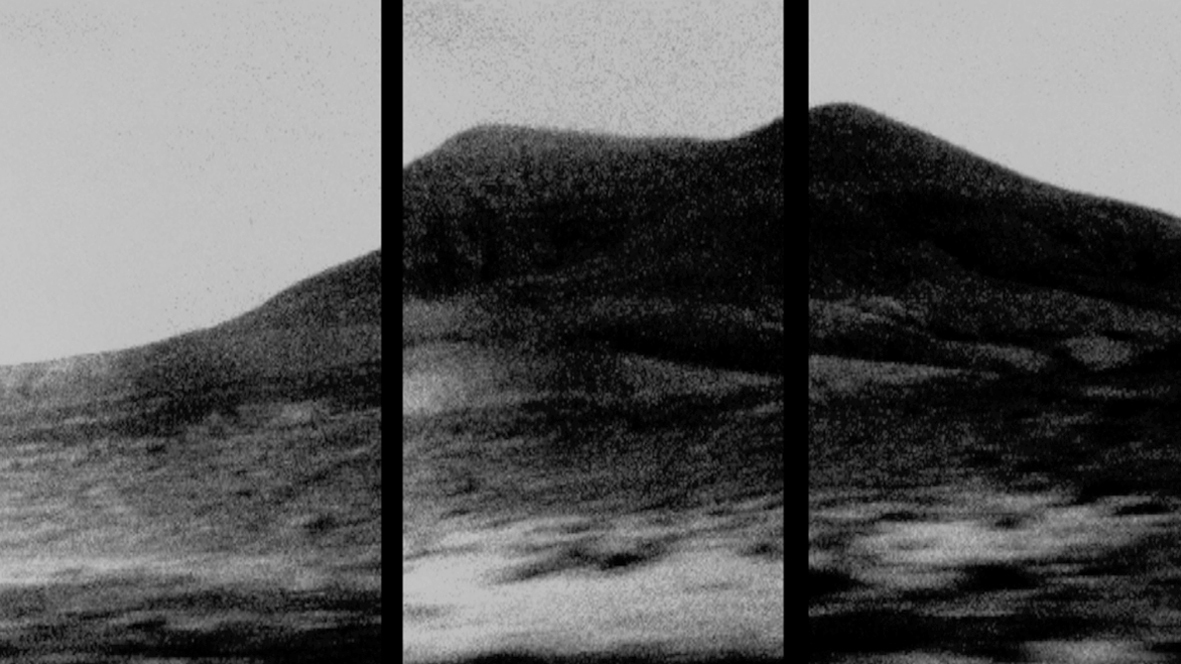 Although this may seem to be a topographical measurement of a stretch of land, it turns out to be a self-reflexive arrangement as the filmmaker has fanned out the recordings in a threefold split screen. In doing so, Krems foregrounds the parameters that constitute the medium: in this case, the relationship of space and time reveals itself as unreliable and non-continuous. The fragmented course of the film image provokes an unstable vision, which allows only the mountain to remain as a constant element in the rhythmic beat of the dimmed and illuminated images. These images join together at random moments, while the perspective of the gaze constantly newly configures. The sharp contrast of the black-and-white images intensifies the oscillation between proximity and distance and also the play of light and shadow introduced in the speed of the spatial transitions.