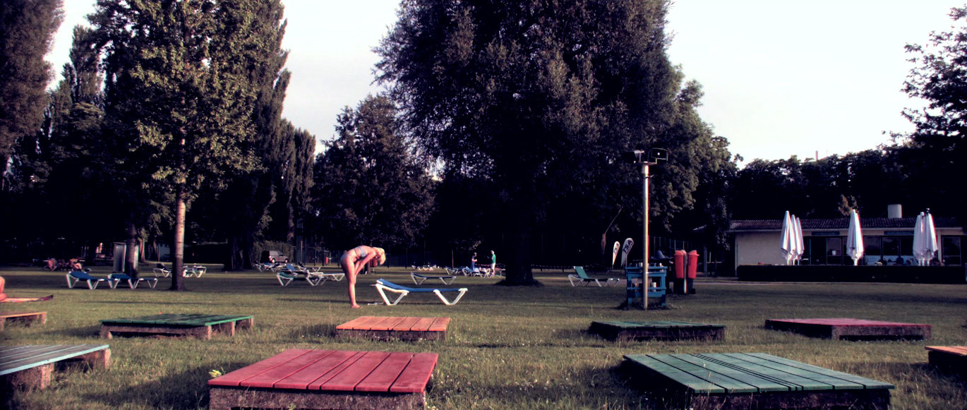 A motionless long shot shows us the nearly deserted field at a public swimming pool: in the foreground are small, colorfully painted seating arrangements, behind them, lounge chairs, trees, a restaurant. Isolated figures, so small as to be unrecognizable, move in the back of the image. A harmonious melody sounds, then a voice from the loudspeaker: "It´s that time again; the day at the pool has come to an end." Half an hour left to change; the pool is now closed for swimming: Badeschluss. The last towels are folded; an older couple walks calmly through the picture, on their way home. (Toby Ashraf)