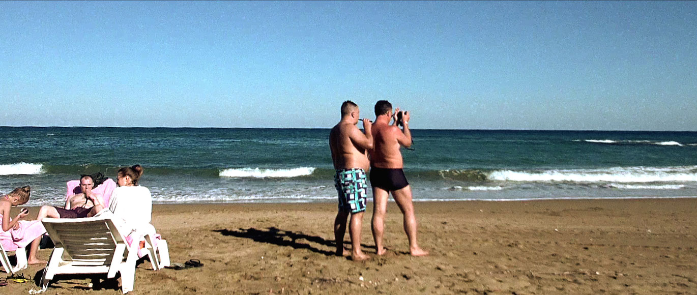Men In Love. A beach. The ocean, a group of tourists: a vacation tableau. Two men in bathing suits, one holds a camera and takes a photo of something that remains hidden from us in this sequence shot. The positions then change and it seems as though the one man is taking a photo of the other whose pose could also be meant for others. The photo is taken; the men press their heads together to look at it. On the soundtrack: O Sole Mio (in German) — my sun. (Toby Ashraf)
