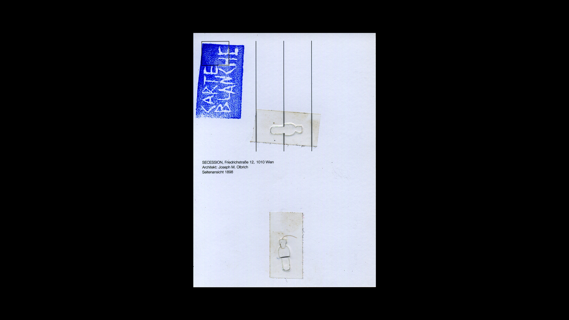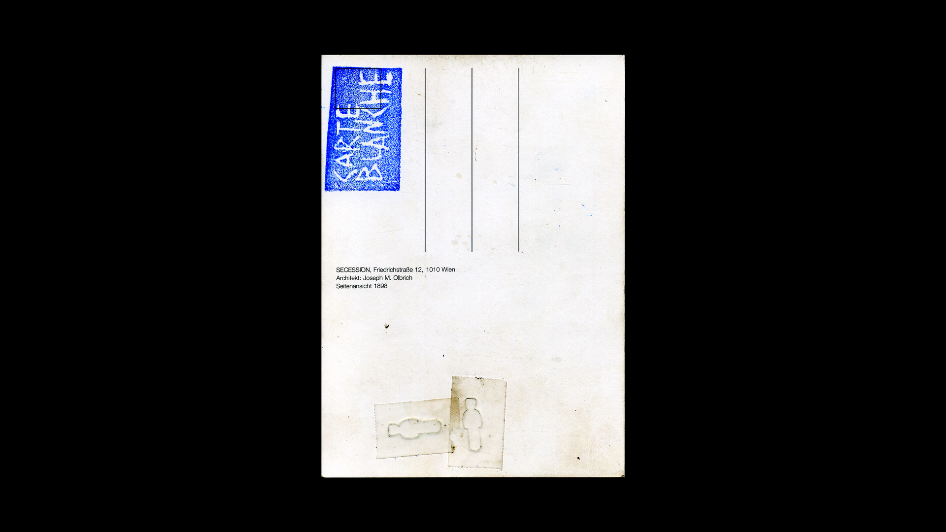 A postcard appears to us almost as a surface; the Secession houses the supposed first white cube of art. All possible things can be scribbled on a postcard. Since the lines for the recipient´s address remain empty, the surface can be understood metaphorically as a carte blanche.
