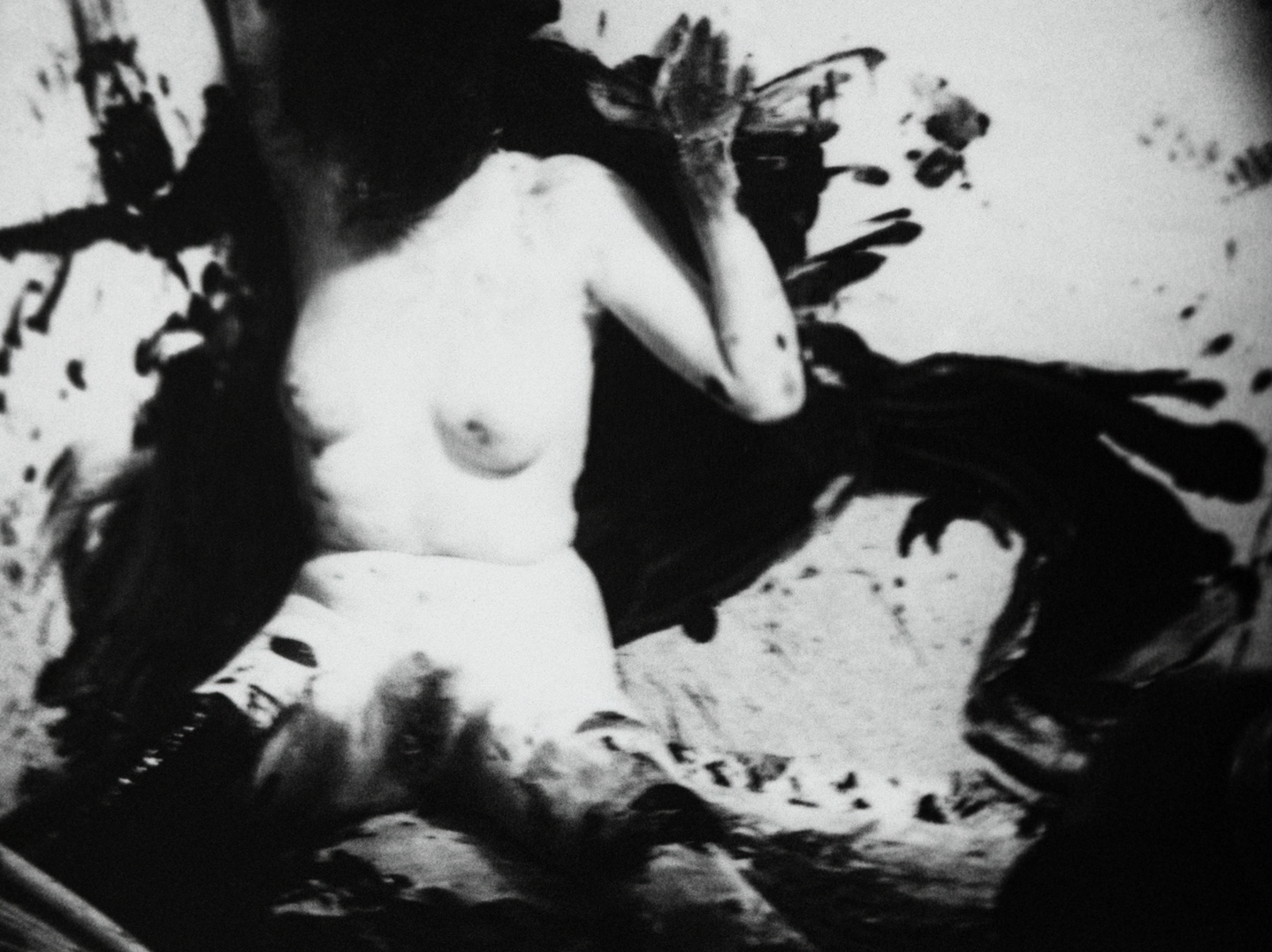 Then comes Kren’s first film with Günter Brus – 8/64 Ana – Aktion Brus. The expressive style Kren is suddenly confronted with makes him depart from seriality and flash editing. His response is the “Great Abstraction”. Free gestural photography corresponds to Brus’s pathos; Kren pumps images of Tachist disintegration onto the film strip. While flash editing had made Mühl’s actions rage, the repetitive qualities had ensured that the “moving ornament” was still legible. The single-frame process Kren uses to record Brus’s action as if writing with his camera makes the image almost less than discernible.