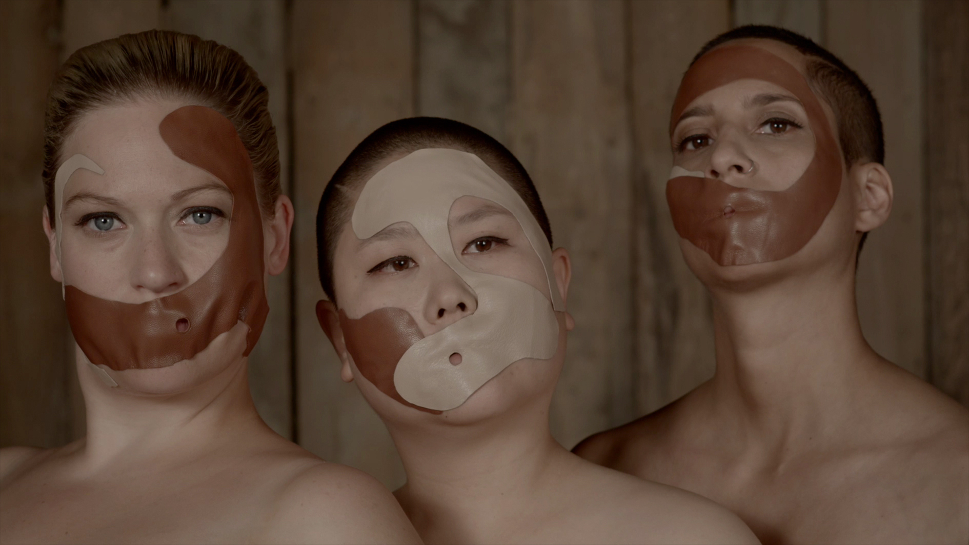 A serrated oval passageway, strobe light, title panels, "Pferdebusen – horse boobs," glittery curtain - horse´s mane - fade out. On the sound track, the sound of horse hooves, in the image, a theater space, details of glass and wood, seat grooves and crystal chandeliers, aroused horse eyes - cut to the starting shape: five protagonists move through this vagina dentata and thus begins the unfolding of a sexually compact visual dramaturgy in which human body and horse body meld in a beautiful and peculiar way: naked bottoms on saddles, leather masks hiding faces, horse anus and the bat of an eye. Wonderfully confusing, beguiling visual worlds are drafted in close-ups deployed like a fetish (camera: Hannes Böck). The point of culmination of every take is desire and fantasy; the gaze´s object and subject become one. The film closes with a climbing scene in a snowstorm. The five protagonists climb up the wall and without ropes, so it appears, resolutely upward, out, beyond the picture.