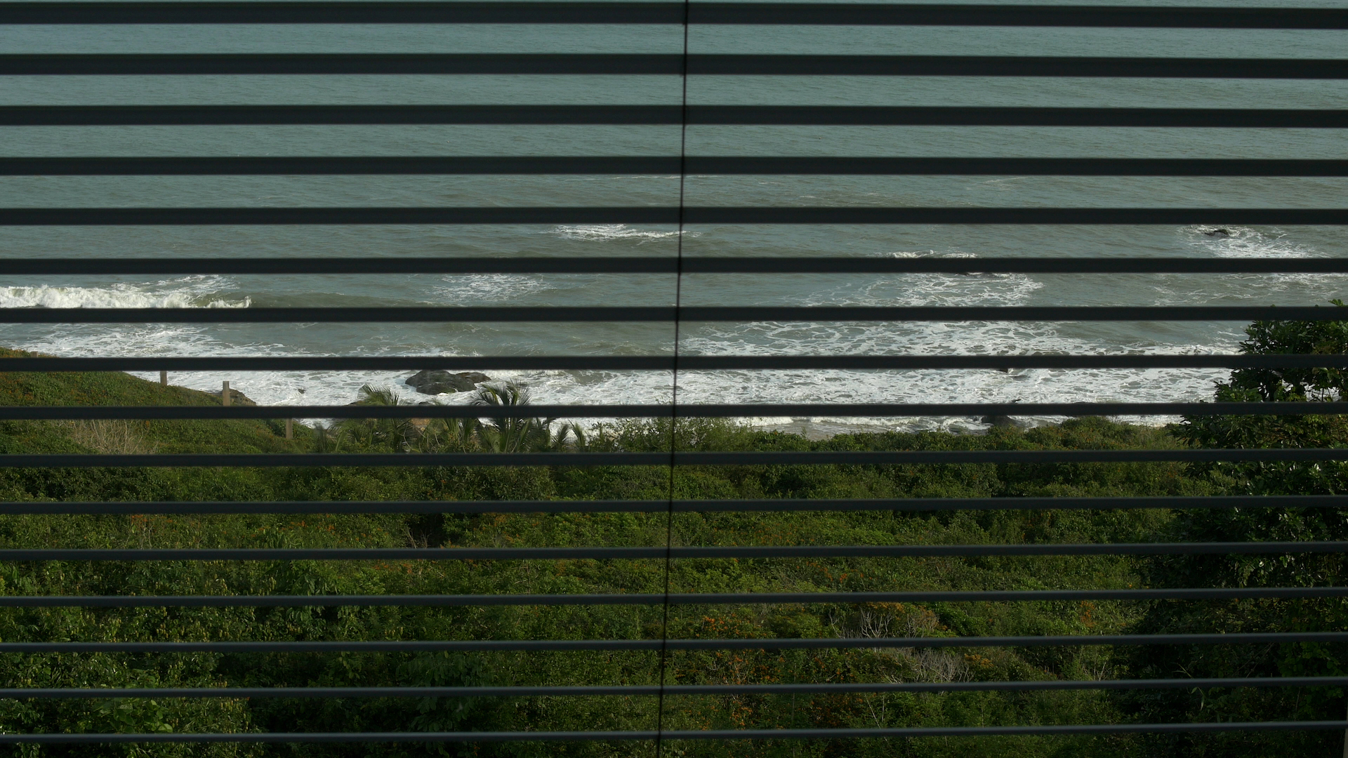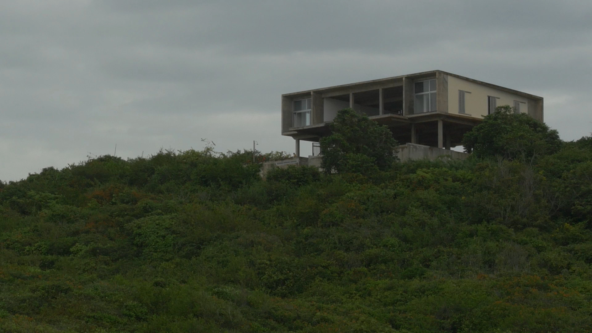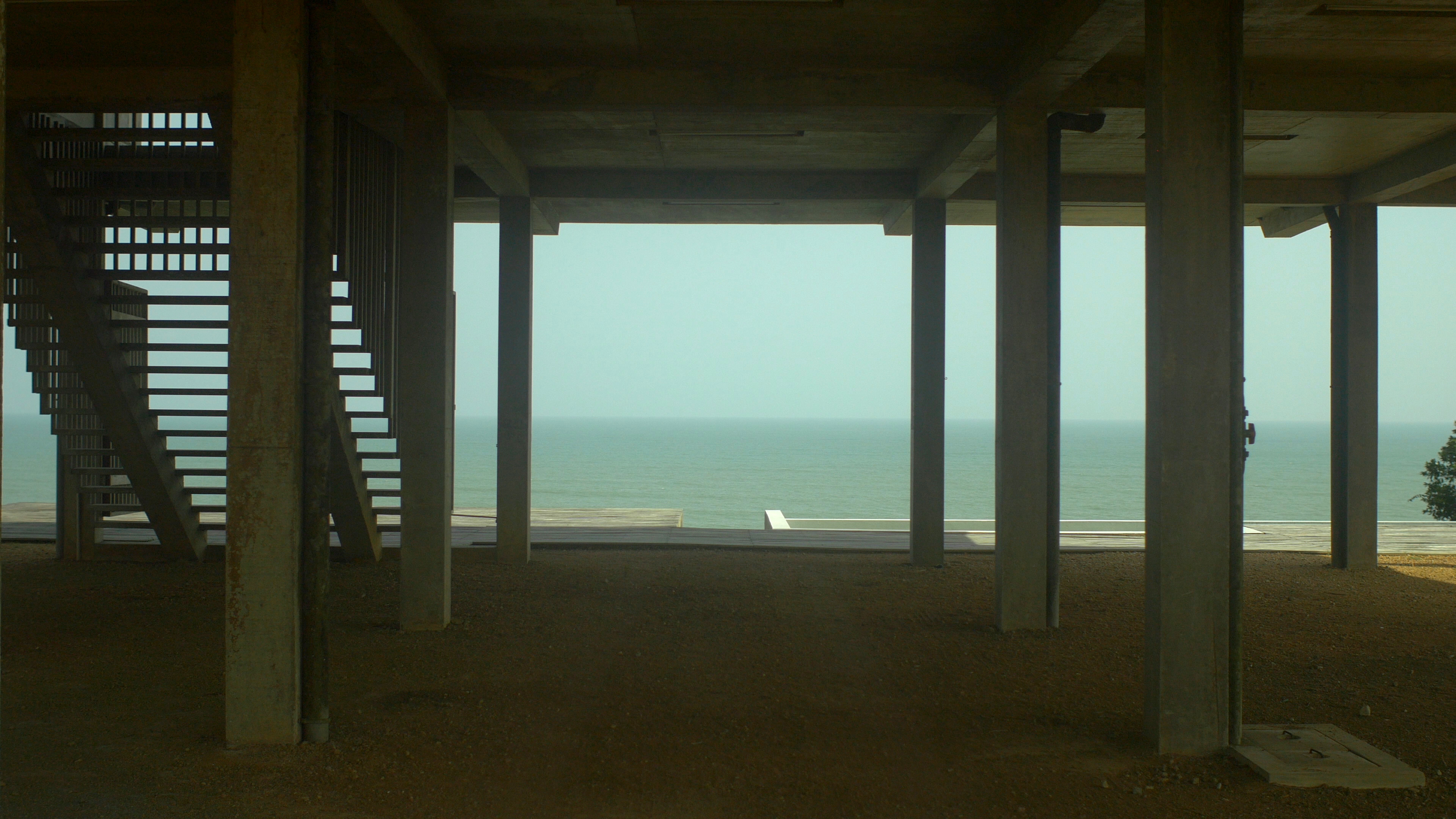 Fishing is not done on Tuesdays takes variously distanced, moving and focused looks at a location on the coast of Ghana. The first building block of a grid that threads its way through the entire film is indicated by a rotating bird´s eye view of a densely woven canopy of trees intersected by an uneven wall. The vertigo of this circular motion shifts into a gradual glide along untreated cement pylons. Their verticality intersects with the horizon line visible in the distance, to be ruptured only by the turbulence of approaching waves. Constructed lines produce visual axes and visual slits, dividing and lending rhythm to an apparently wild growth of abundant vegetation. These lines and grids do not divide the interior and exterior but rather create openings and passageways.