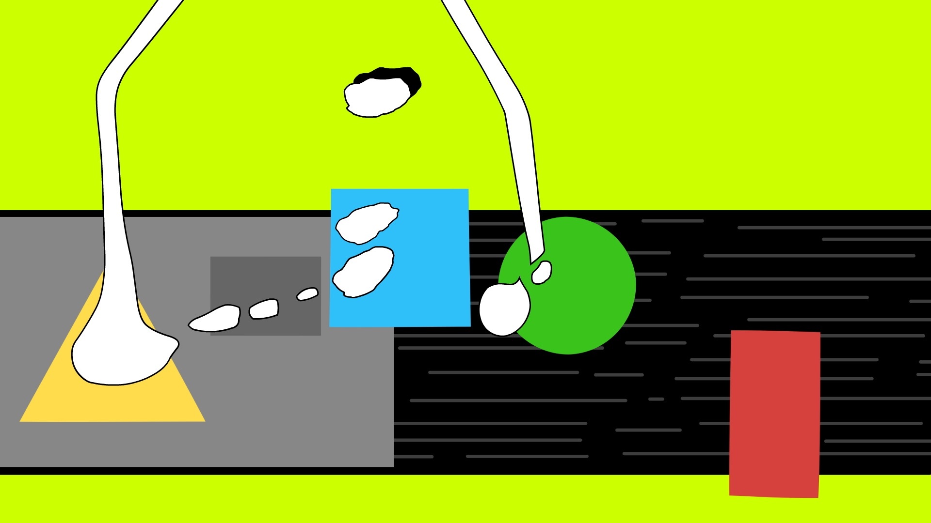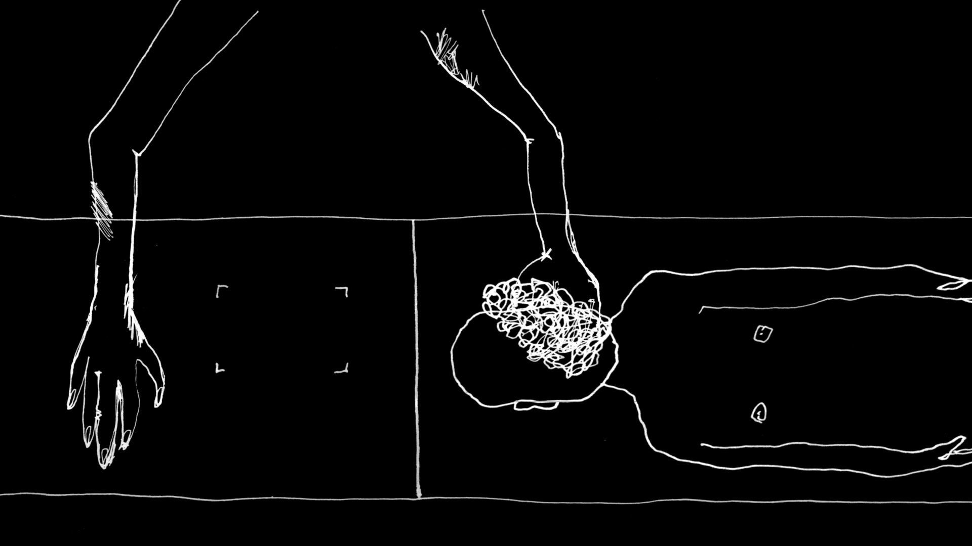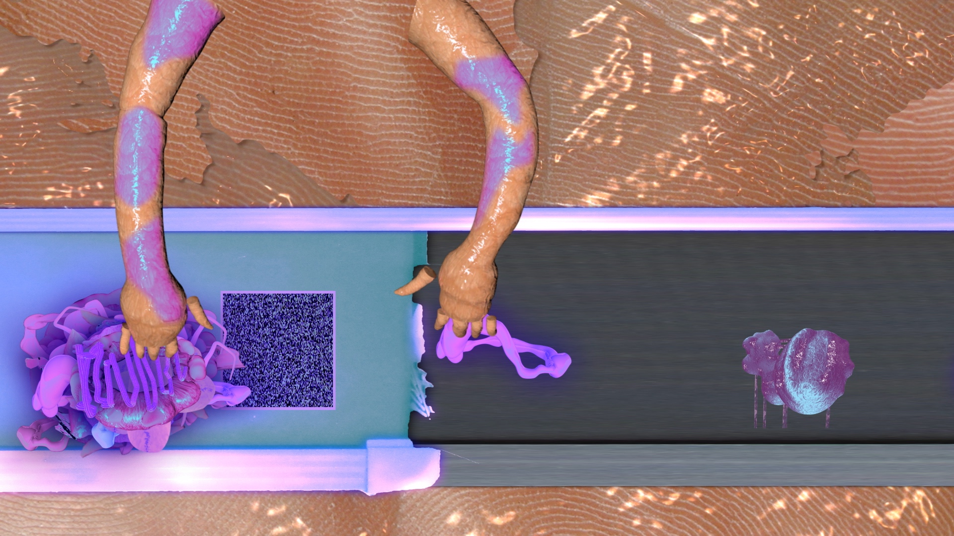 One bird´s eye-view shot shows solely the hands of a person tending a supermarket cash register, receiving and scanning objects. Radically different stylistic and technical methods were used by the artists who contributed individual statements to this project (Parastu, Line Finderup Jensen, Adnan Popović, Juri Schaden); the montage is similarly unconventional in its resistance to a linear narrative. The artists no doubt share a fundamental mistrust of our affluent society; the supermarket conveyer belt becomes a metaphor for unquestioning consumerism, showcasing diverse irritations as well as more gross disturbances. When a cashier takes a cigarette break, the unsupervised objects on the conveyer belt pile up into a growing mountain of chaos. A person is suddenly lying on the belt and gets swallowed up by the apparatus. Cut-off hands are soon seen moving along instead of vegetables and fruit. The functional world of consumerism is visually dismantled, reaching highpoints in the zombie-like arms of a skeleton or when missing data in a digital montage sequence is replaced by color test images: Even the most familiar visual logic breaks down in this playful experimentation with trash aesthetics, and a dash of humor is consistently part of the mix. The film music composed by Vinzenz Schwab connects the contrasting visual sequences and oscillates between realistic acoustics recorded on location and electronically manipulated sequences and sounds. (Thomas Renoldner)