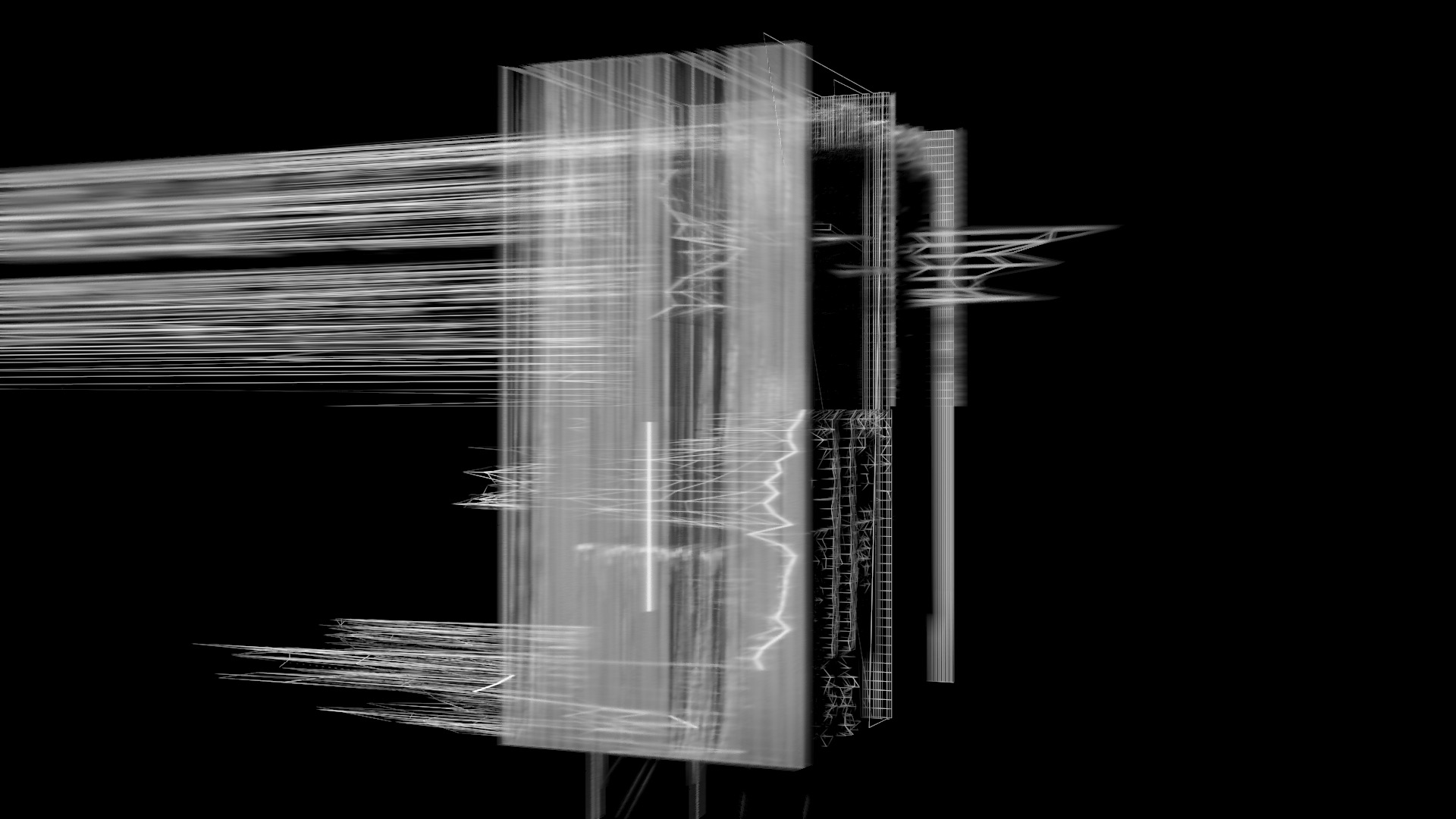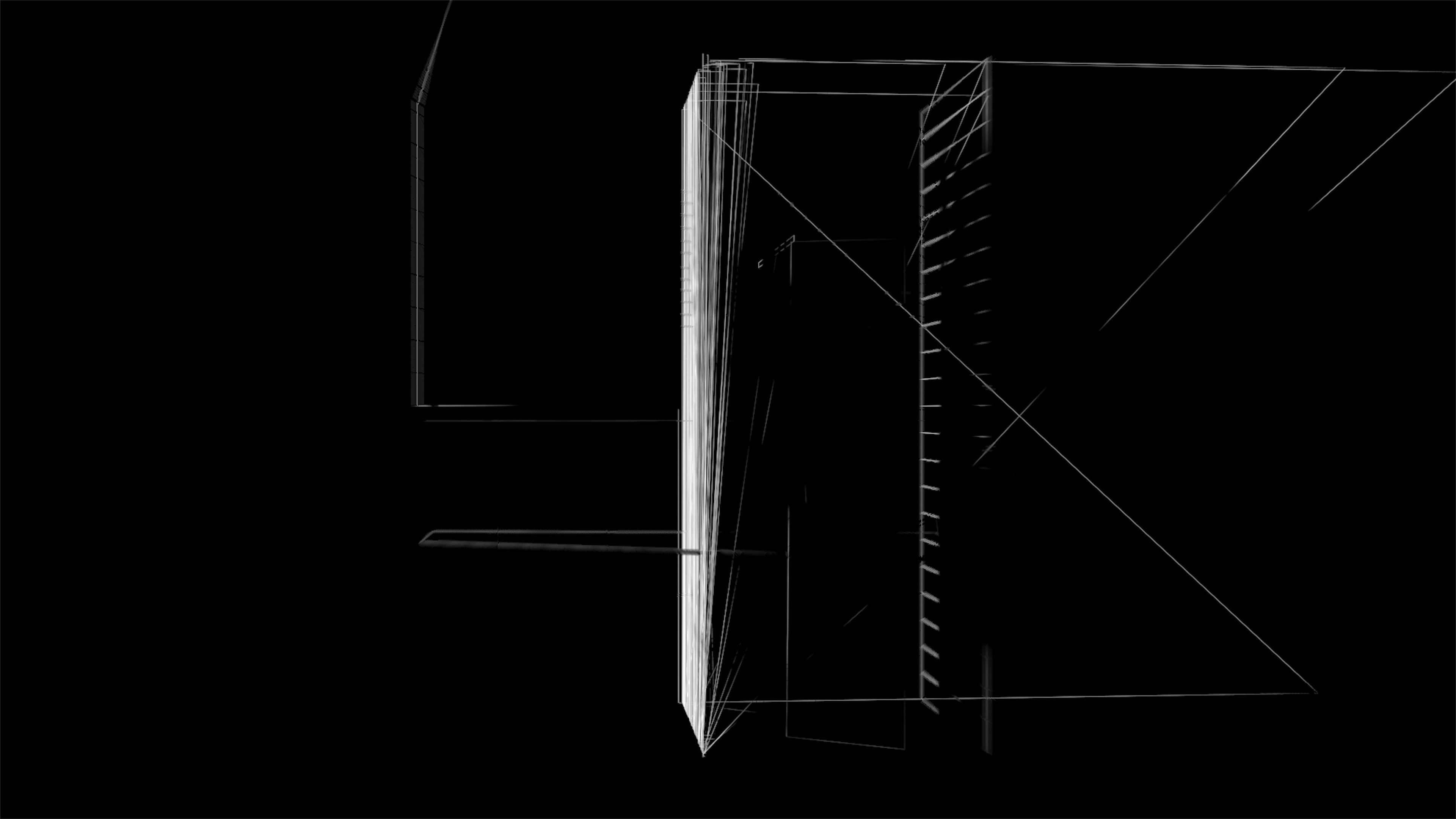 This happens at the same time with several surfaces that together form an architecture which in turn is the starting point. These surfaces consist of lines whose number is controlled and thus influences also as a factor in the refraction or folding of the room. Spaces of space occur which are superimposed within the architecture again as spaces in the space or projections of different spaces that overlap.