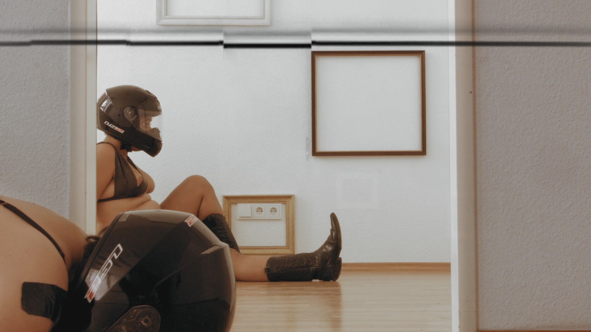 The graphic "mask" overlaying the scenario is reminiscent of a computer game. It is black and initially abstracts what is happening underneath it. Only very gradually is the viewer able to see through a slit as it moves over the image and a bright spot offering a glimpse of three performers. Their appearance is impressive: They are wearing black, full-face helmets while their bodies closely modelled with tightly wound black tape reveal their "nakedness".