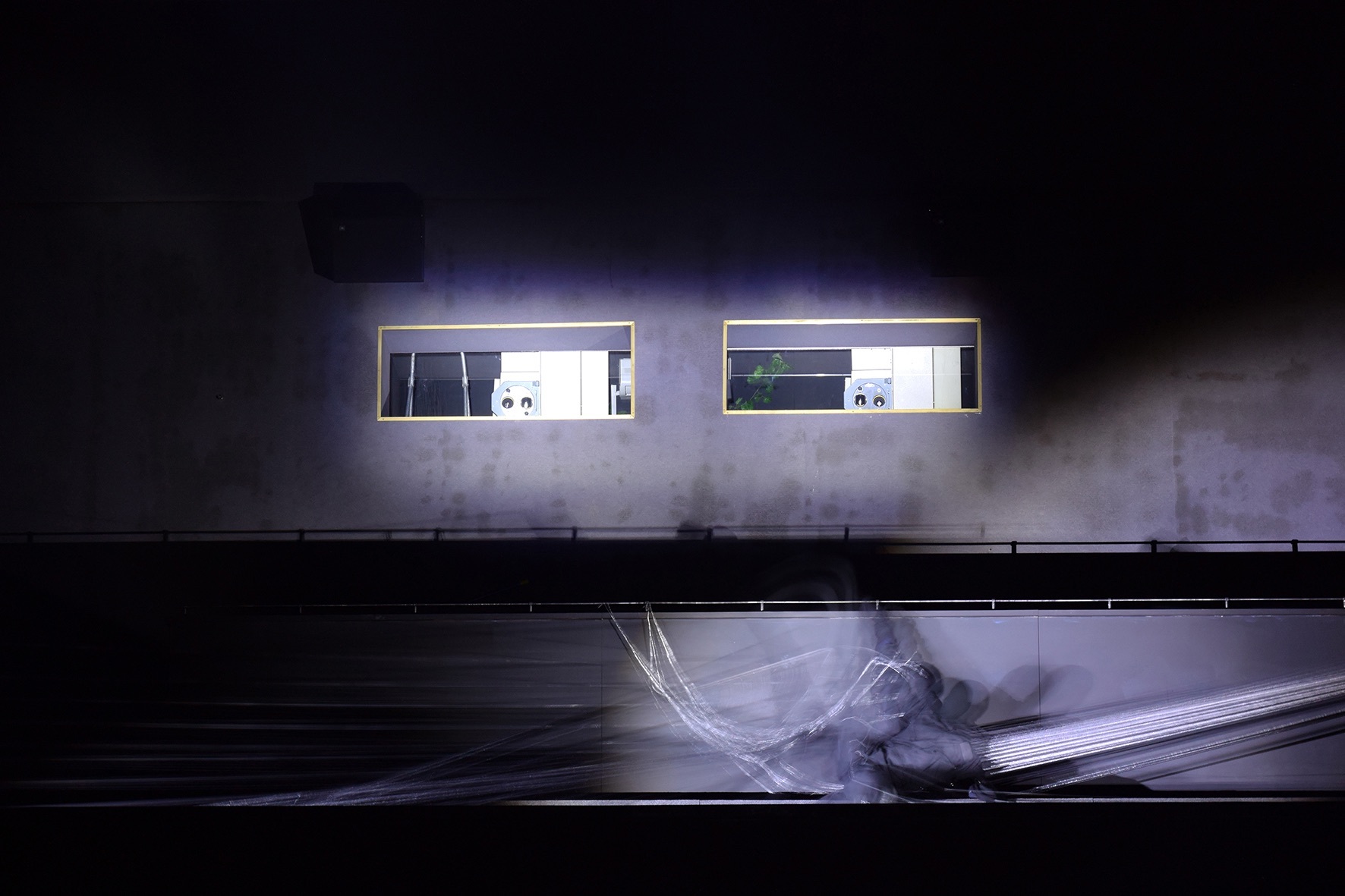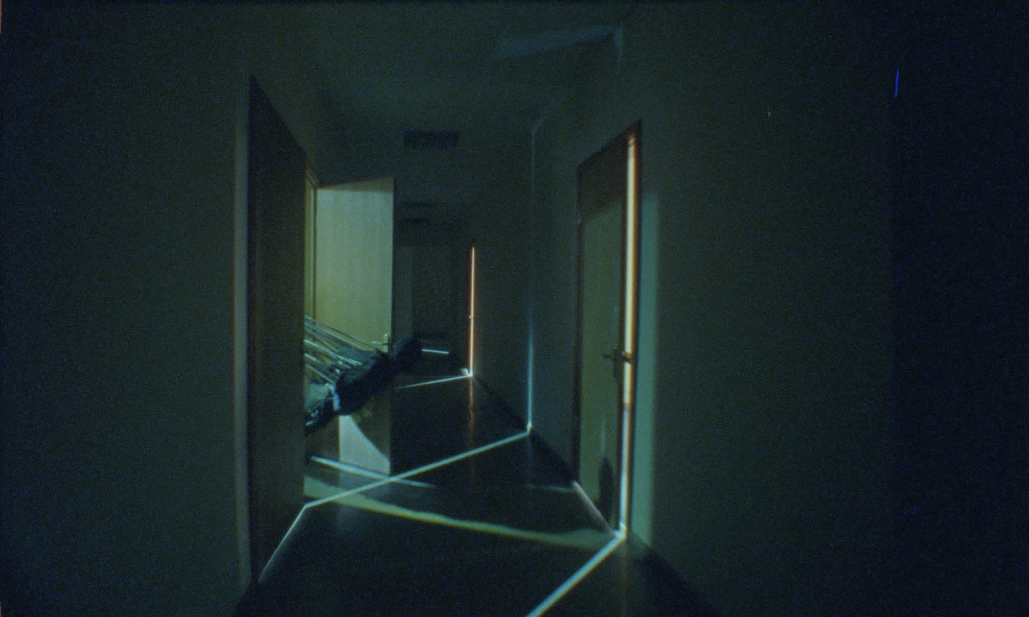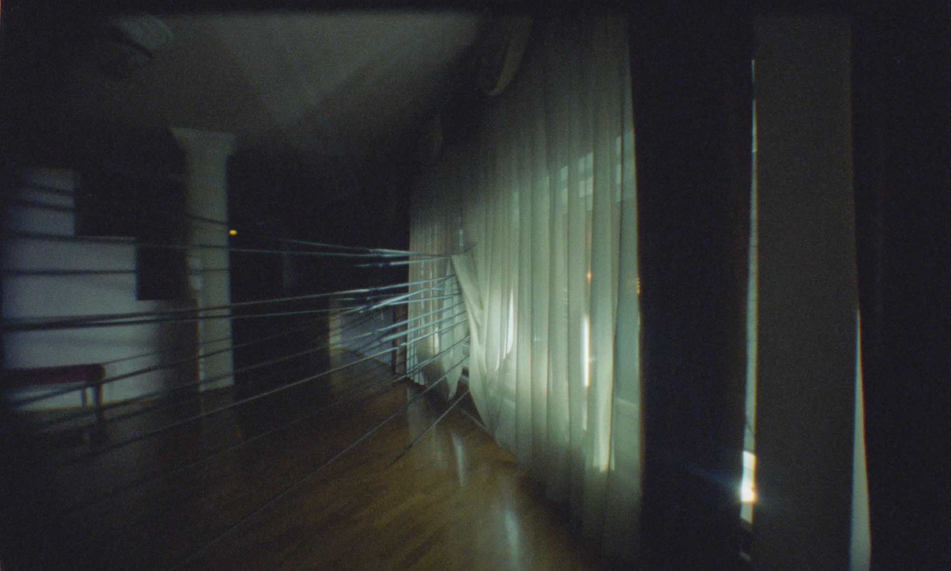 The film´s title designates a luxury housing block in Moscow, built around 1930 for Stalinist officials. This is something we cannot see. Not really. But somehow, we can, because we are being shown the interior and the roof of an empty-looking building: dark stairways, rooms, corridors and halls, along with glimpses of a metropolis at night in the background. Most of all, however, this film shows vibration: it is vibration. A phantom-like figure (in the end there will be two) moves through these spaces ditheringly, attached to bright filaments reminiscent of a gigantic web. Vibration pervades everything we are being shown here – all of the house and all of the image. It all jerks in a stop-motion-like non-movement caused by changes in the lighting.