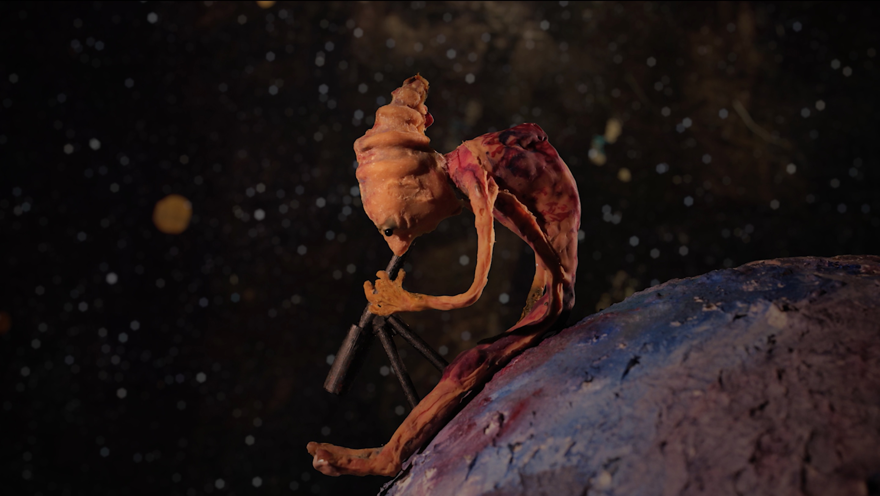 Hearing the being’s thoughts: this was once a place full of stars that serve(d) the inhabitants as nourishment; the cosmos is meanwhile depleted, they were crazed by hunger. The relationship to the surroundings and ultimately, to their own existence was cut off. What happens with our ideas when we disappear? Where do we go? Who am I, embedded in the worlds that surround us? These are no less than life’s existential questions floating implicitly in space, framed by sparsely employed spherical sounds. The gaunt body of the creature once revolved like a fetus in “mother space”—a connection that has been long forfeited. The nourishing umbilical cord has turned into a silken thread.