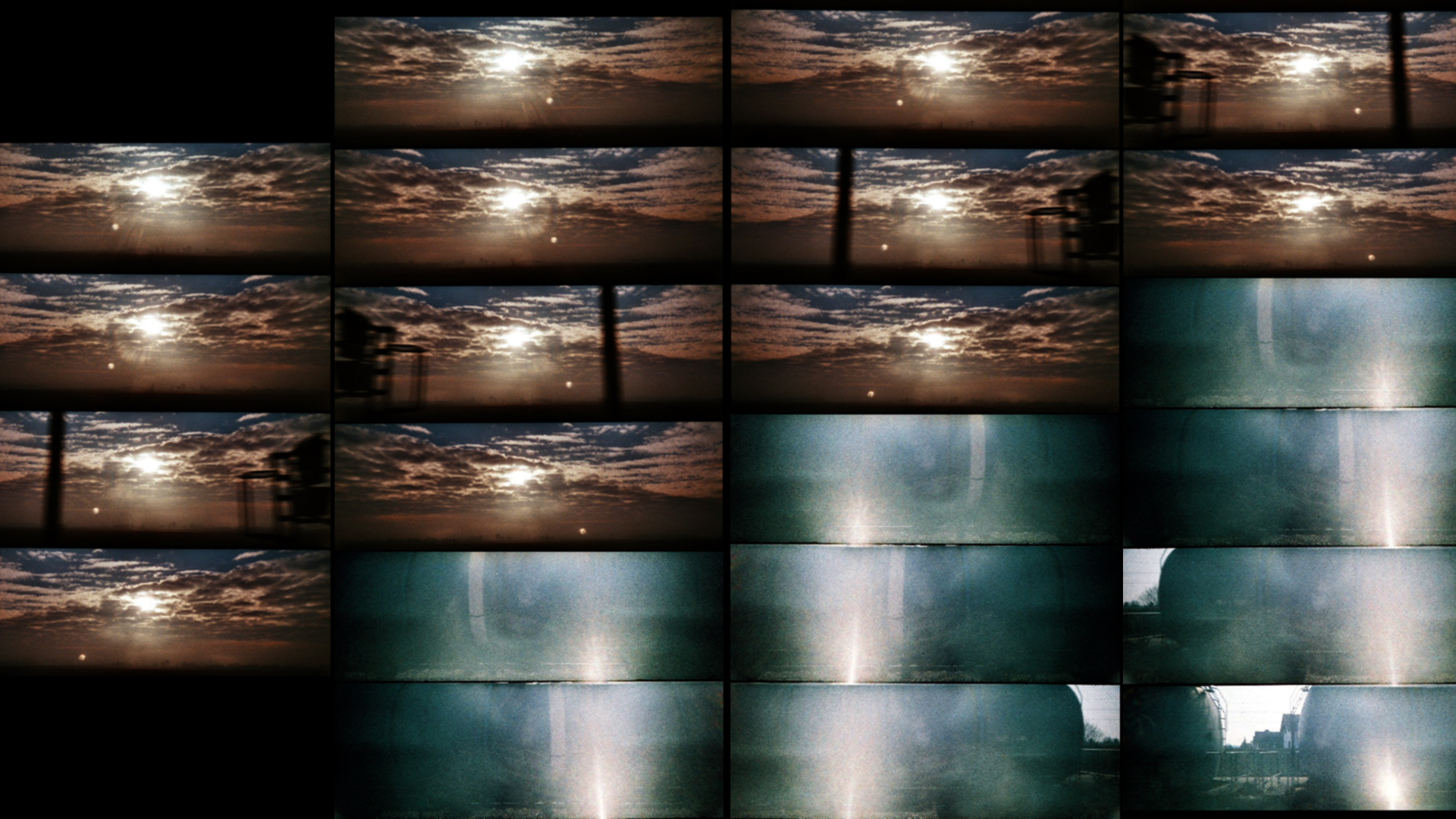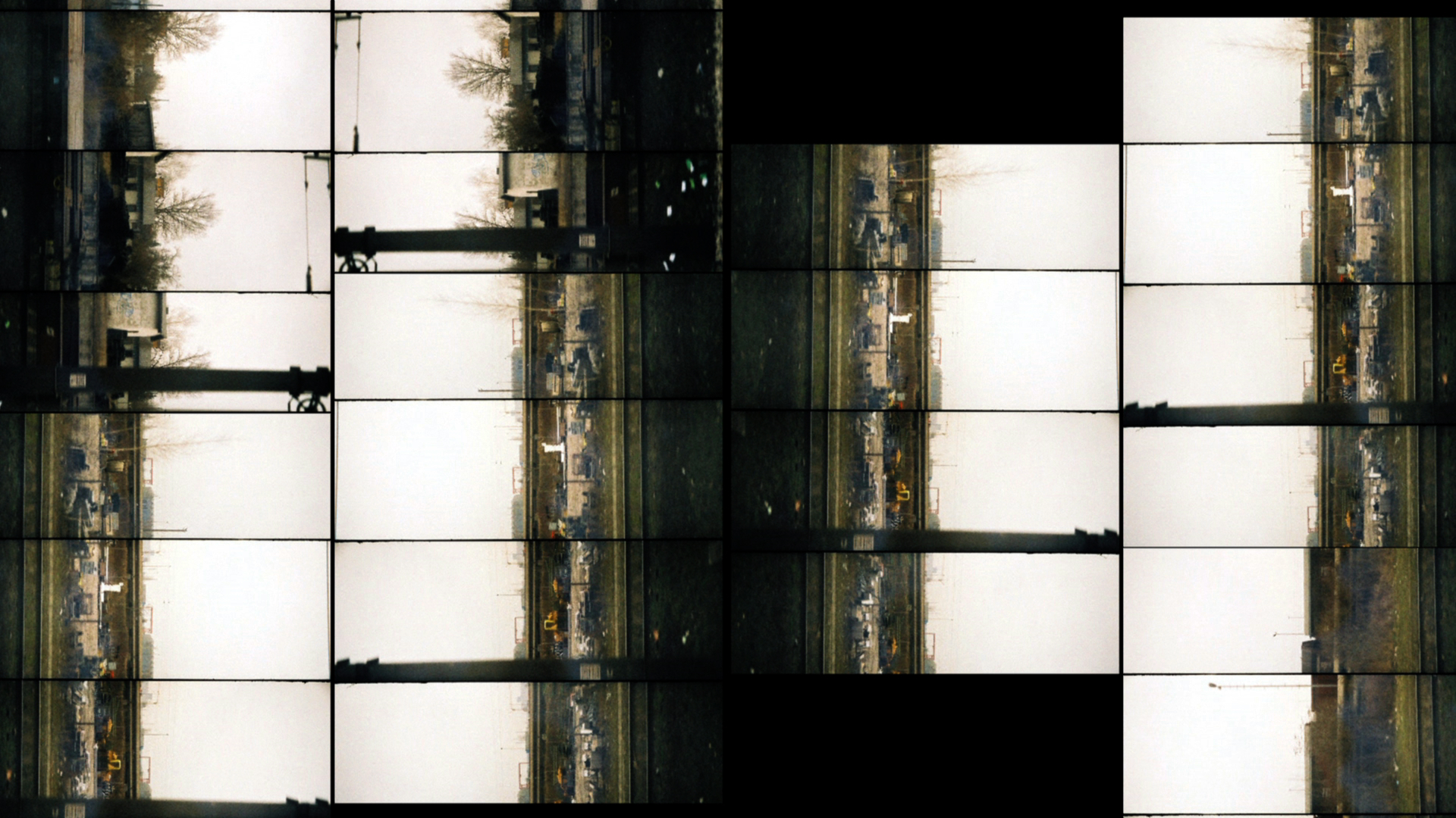 The dynamic performance of drummer Jörg Mikula serves as the trigger for a new work by Siegfried Fruhauf that explores the reciprocal relationship between the two time-based media of film and music in a wild way. WHERE DO WE GO reveals itself to be a synesthetic experiment rendering sight as rhythmical and the visual edit as musical. The filmmaker painstakingly animates brief phases of movement recorded with a Lomography Supersampler* to create a visual series of trains, tracks, bridges and nature that are re-constellated and brought together in a multiple split-screen projection. He edited individual photographic fragments into a continuous stream of images, a perforated time space continuum in which the motion of one image seems to be transported to the next image, expanding and contracting in space. Horizontal and vertical lines serve as points of orientation that stabilize the image. Additionally, Fruhauf employs structuralist strategies, proceeding analytically and playfully at one and the same time. He reacts to shifts in rhythm and pitch with visual multiplication, mirroring, and serial sequencing so that the pulse of the drumbeat is not just synchronized with the montage but rather the whole visual space starts to dance. With mathematical precision, he pieces together a landscape that synchronously unfolds to the sound of the drums, allowing structures and forms to come into focus. It is an iridescent play of lines, colors, and surfaces that leads with an accelerating tempo ever more deeply into abstraction, till all that can be recognized in the end are vibrating patterns causing the whole body to vibrate. The multipartite variable split-screen and leaps in motion are reminiscent of Muybridge´s early photographic studies and the origin of cinematic illusion. With WHERE DO WE GO, Fruhauf further develops his structuralist cinema, focusing on the rhythmic quality of montage and the continuity of something in between, to transmit the original fascination of motion pictures. (Shilla Strelka)
