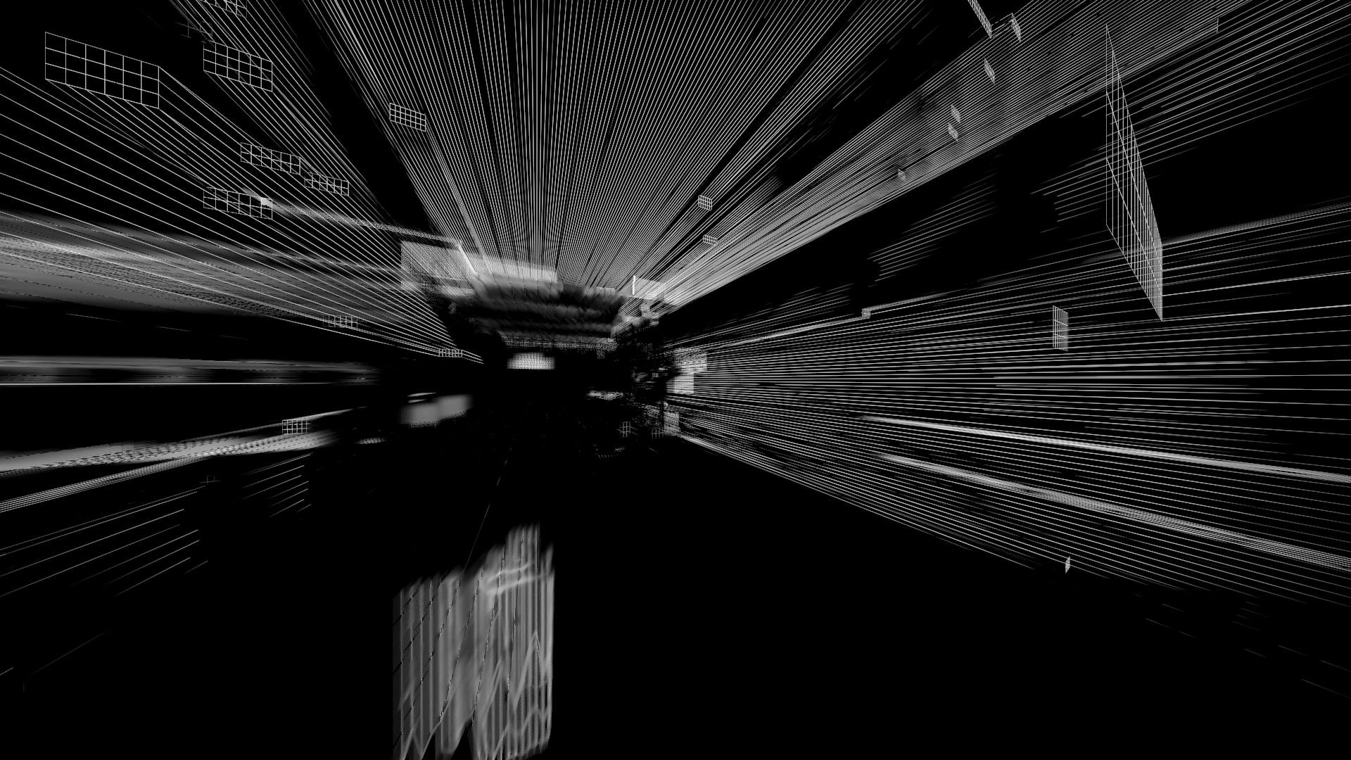Like a holodeck with 30Hz. One could also say that the state switches from a two-dimensional surface or line to a three-dimensional space and back. Depending on the frequency, the space becomes perceptible or changes the movement and thus projects itself into the black empty space. The frequency has a size of 30 frames per second ... That means the state of two to three dimensionality can switch between once and thirty times.