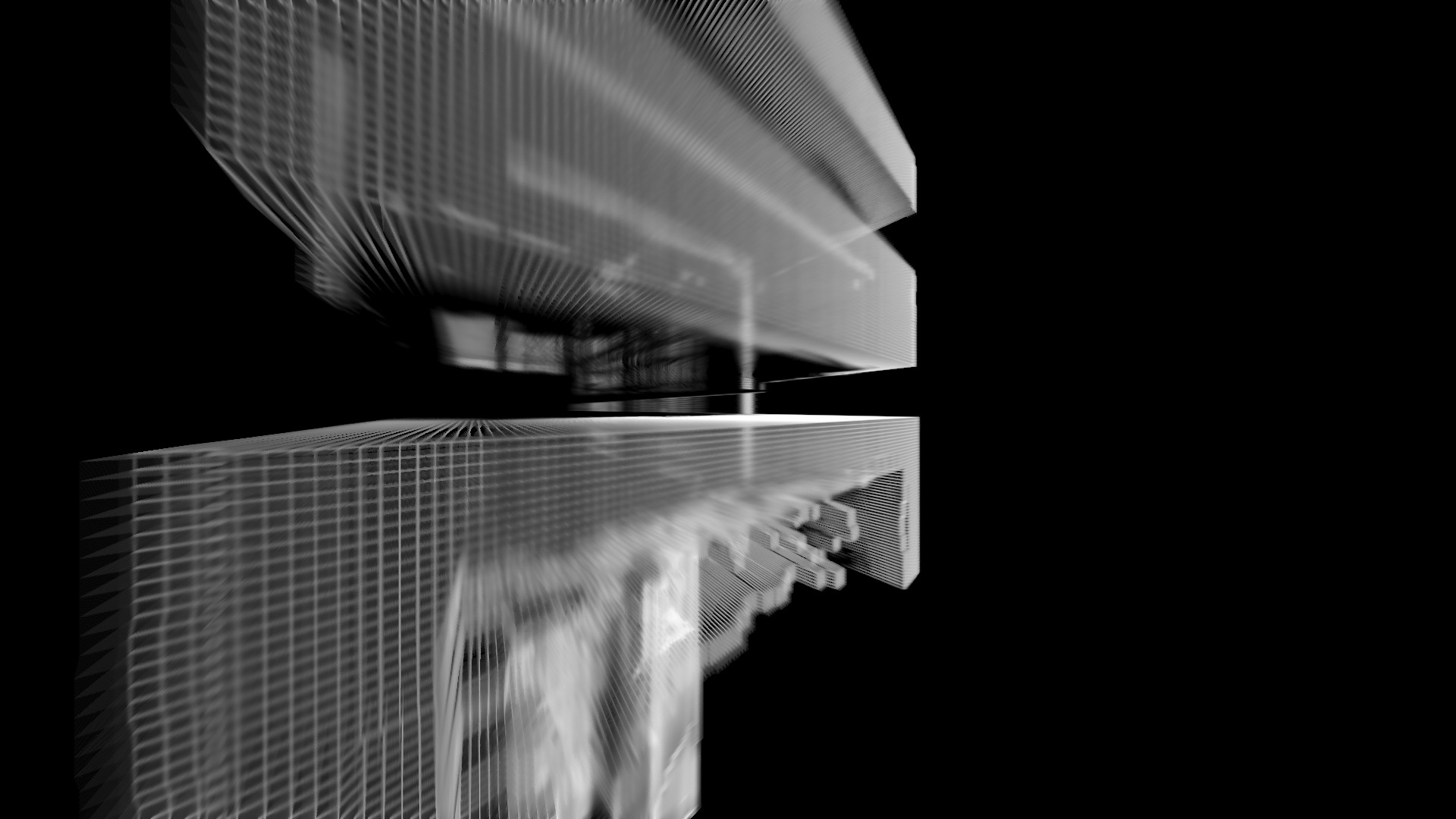 This happens at the same time with several surfaces that together form an architecture which in turn is the starting point. These surfaces consist of lines whose number is controlled and thus influences also as a factor in the refraction or folding of the room. Spaces of space occur which are superimposed within the architecture again as spaces in the space or projections of different spaces that overlap.