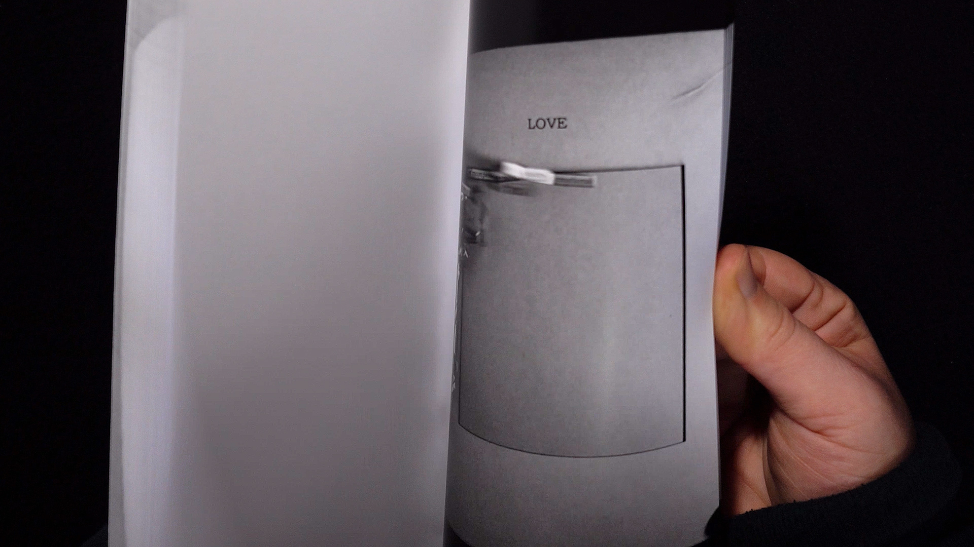In the first episode with the title "Self-Portrait" she demonstrates an object made out of simple everyday objects such us a metal bucket, an ordinary lamp, magnifiers, rope and paper coffee cups. When she pulls the rope the lamp starts pending and the object transforms into an audiovisual instrument, which projects a frustrated figure who looks like the artist and starts hitting her head on the wall of the projection. A similar story takes place in the third episode with the title "The book of falling words 2," Vasof demonstrates a flip-book which shows the footage of a real book in which the words of different meaningful chapters are falling down.