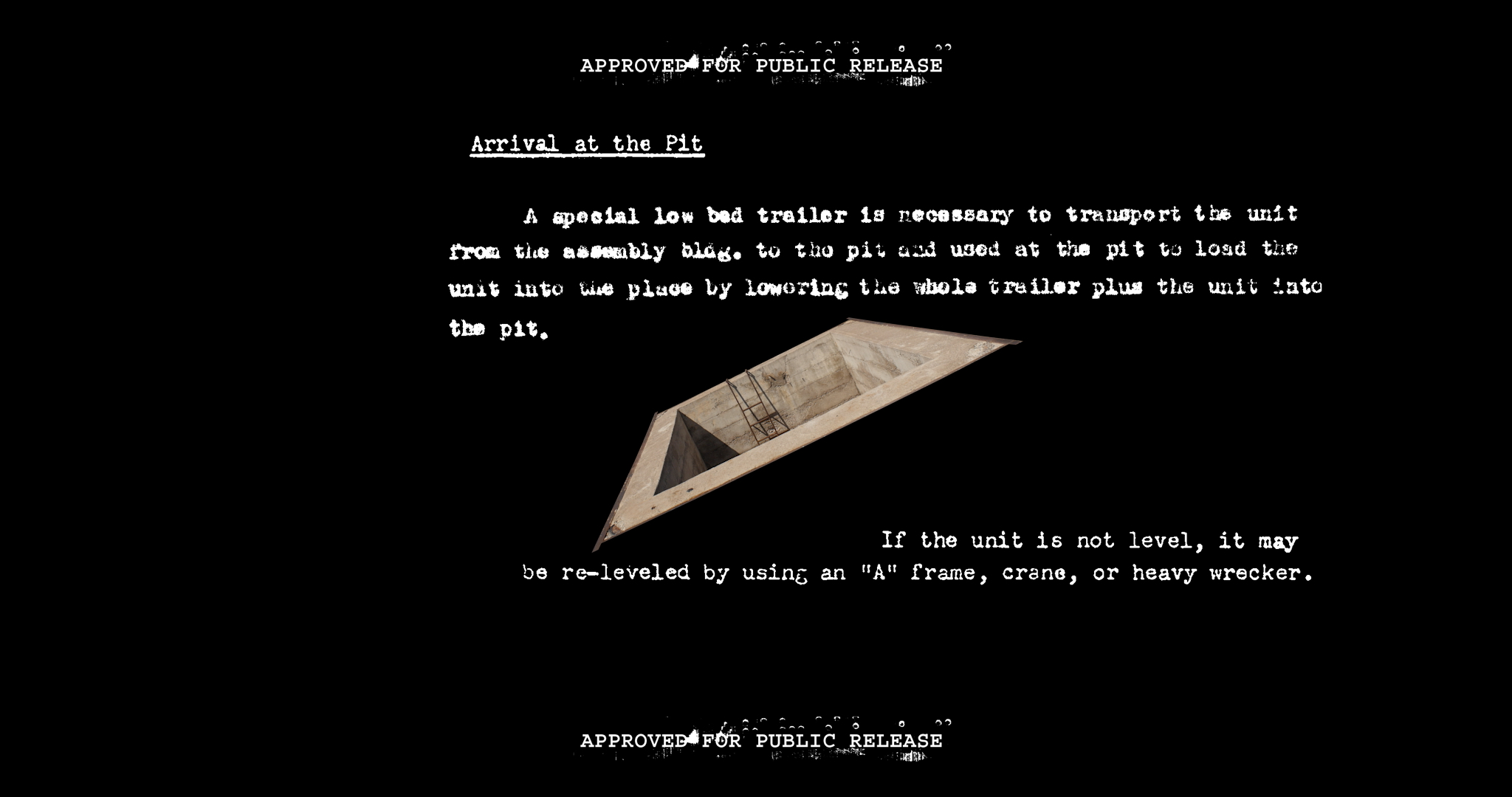 In an anticlimactic minimalist staging, the camera stands still in a remote corner of the Utah desert, revealing an atomic bomb loading pit used for military practice, while a voice over reads parts of the unclassified user manual "How to built an Atomic Bomb Loading Pit" released to the public in June 1946. The sonic suspension imposed by the computerized slowness of the subjectless reader frames the deep time dimension of this arid dusty landscape in Wendover. We are led through details of the manual, which suggests forms to best-adapt to the terrain, climate, soil conditions in the pit area, to allow for the needed cleanliness and security precautions for Boeing B-29 atomic bomb loading. Later in the film the loading pit starts to deform and drift in voided suspension, isolated it from its environment. Dramatizing the implicancy of this site of warfare in its semiotic and physical density, the camera approaches the space slow motion, replicating the angle of sight of the airplane pilot. The concrete, practical materiality of the pit contrasts the exponential scale of the planetary consequences brought upon by this piece of infrastructure. In this construction eroded by the light of the desert, we encounter what is perhaps one of the most significant monuments that mark the end of the holocene.