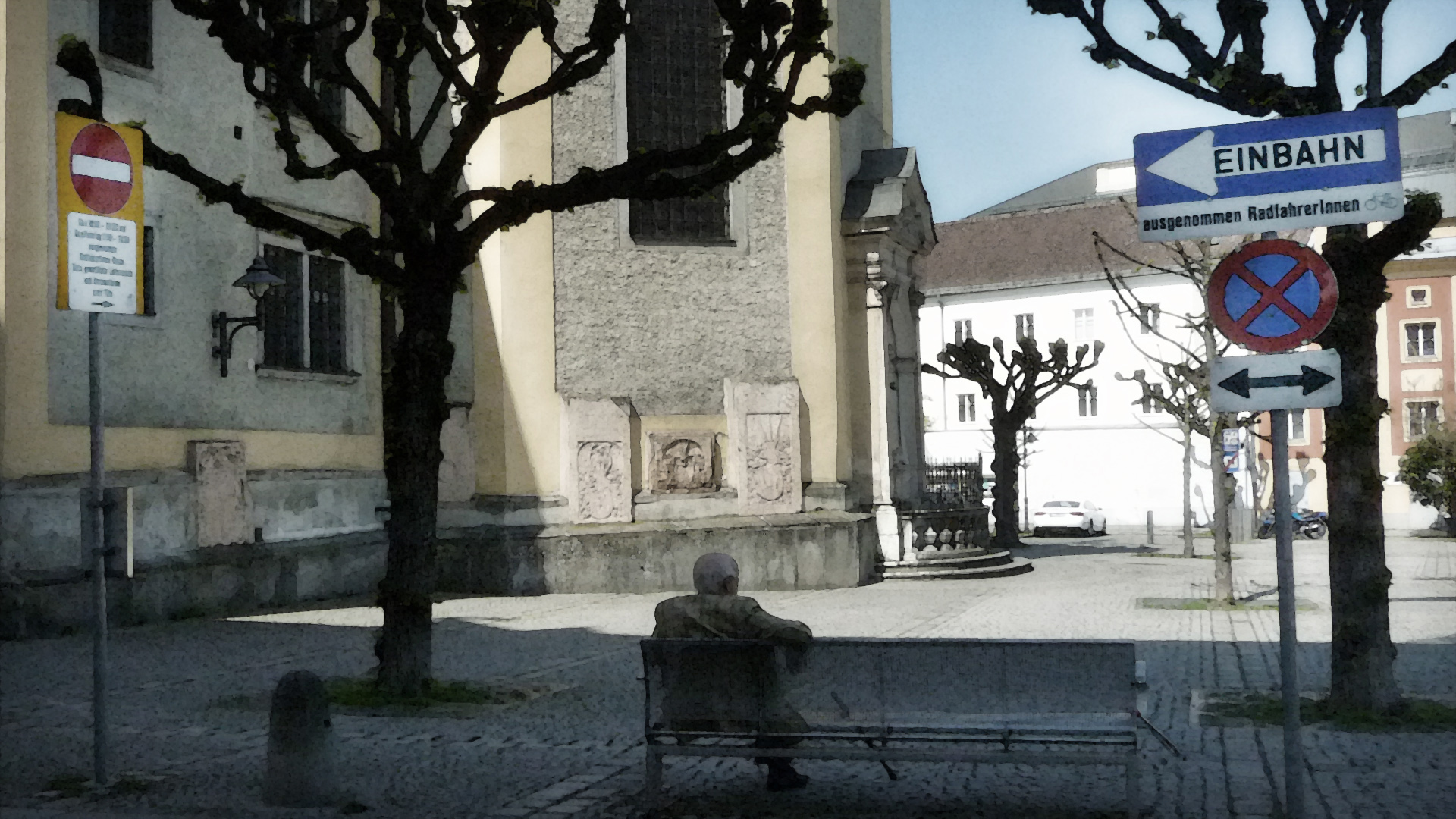 outside of the church, the photographic animation observes various events throughout the day. (production note)