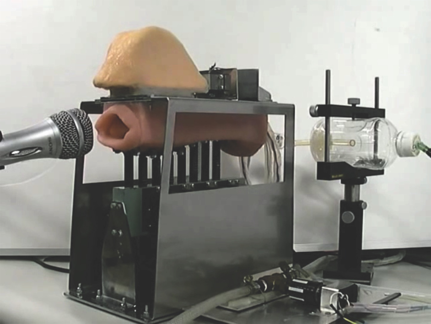 What looks like a beefy sea cucumber sunk in a toaster without casing is actually a computer-controlled organ of speech. From a YouTube clip of the singing latex mouth montaged after and next to itself, Norbert Pfaffenbichler generates an unconventional collage of images. Loops, duplications, and interferences ultimately condense the solo voice to a noisy-experimental drone composition— an Austro-Japanese audio-visual mosaic.
