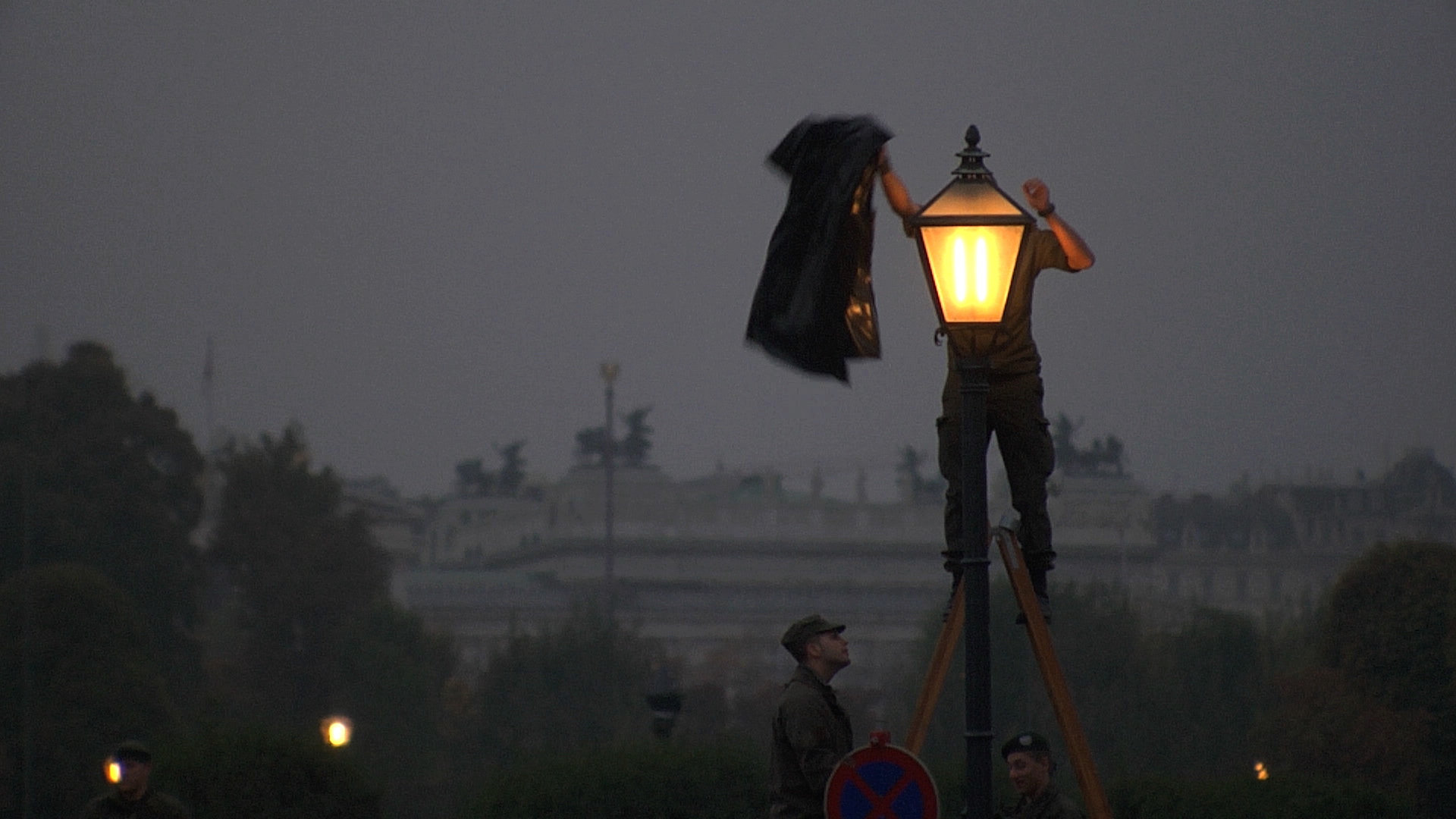 A few days before October 26, men clothed in green camouflage prepare Vienna's Heldenplatz [Heroes' Square] for the country's National Holiday, setting the stage for the parading of Austria's Armed Forces. Georg Oberlechner documents the event in four chapters headed by titles hearkening to military maneuvers. It all begins with "Approaching the Enemy" and the construction of what turns out to be a Potemkin-like village involving tents, motor vehicles and all kinds of military equipment. The nightly arrival of tanks traveling along Vienna's Ringstrasse Boulevard under police escort crystalizes into the climax of the chapter. On the day that the military spectacle is to take place, a suckling pig does its rounds, already roasting on a spit in the wee hours of the morning. Later in the day an honorary regiment seen standing at military attention divides in two for the Federal President to make his way into the chapel of the Imperial Palace where the Federal Chancellor lays a wreath in honor of those who fell in the World Wars and a priest asks God to bless all the dead as well as living soldiers. While a prayerful atmosphere continues to linger in the chapel, a festive mood under heightened media attention takes over the Heldenplatz.