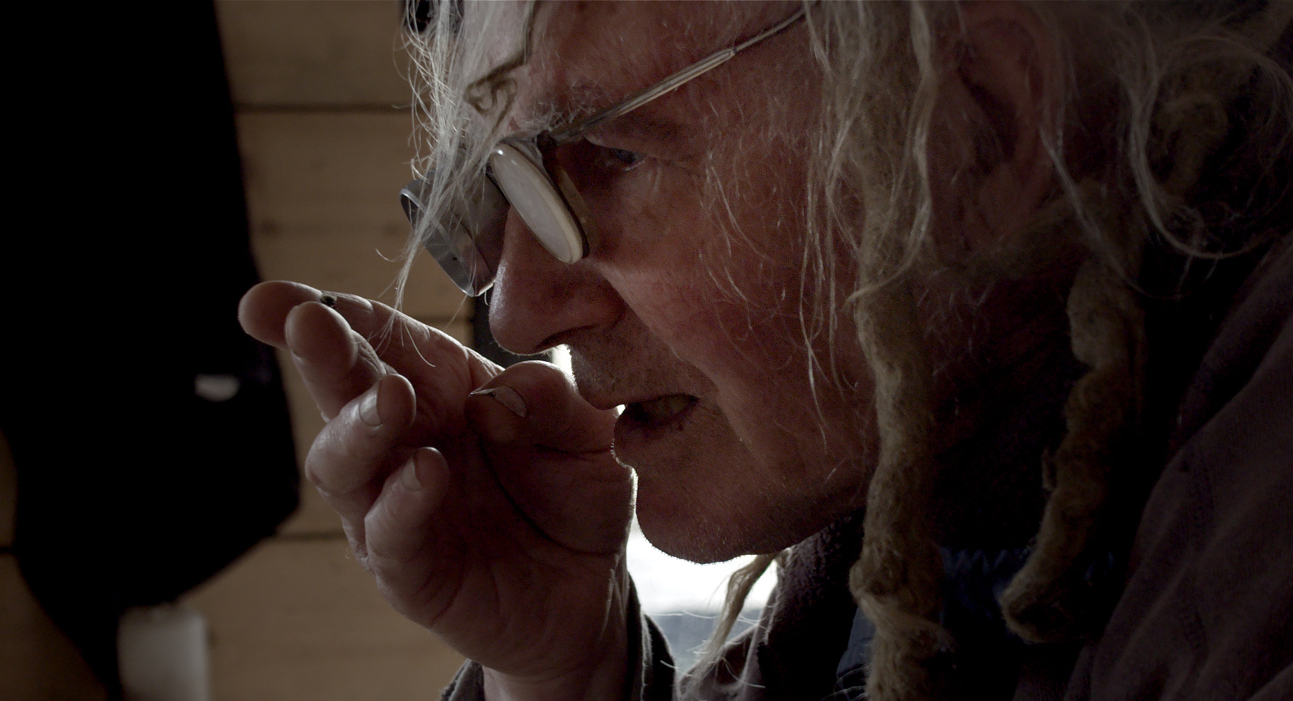 Alex lives as a hermit on the Atlantic coast of Ireland. He rarely socializes with human beings, sharing his life with animals instead – birds, geese, donkeys. Smaller creatures also find shelter at his place. Observing flies and spiders through a jeweler's loupe, Alex takes pains that the law to eat or be eaten is not a possibility in his own kingdom. "There is nothing more important than anything else." This universal equality of all living beings would amount to a radical non-violence among the creatures. As far as Alex is concerned, he has made this utopia a reality in his little world. At a certain point, Jan Prazak asks, who is Alex? "Who am I? God, I'd like to know that myself." Alex has decided to live in the present as simply as possible, an individual, dismissing notions of the future and past as ill-conceived. Perhaps this is also his way of existing on par with all the beings that surround him, for it is said animals do not perceive time.