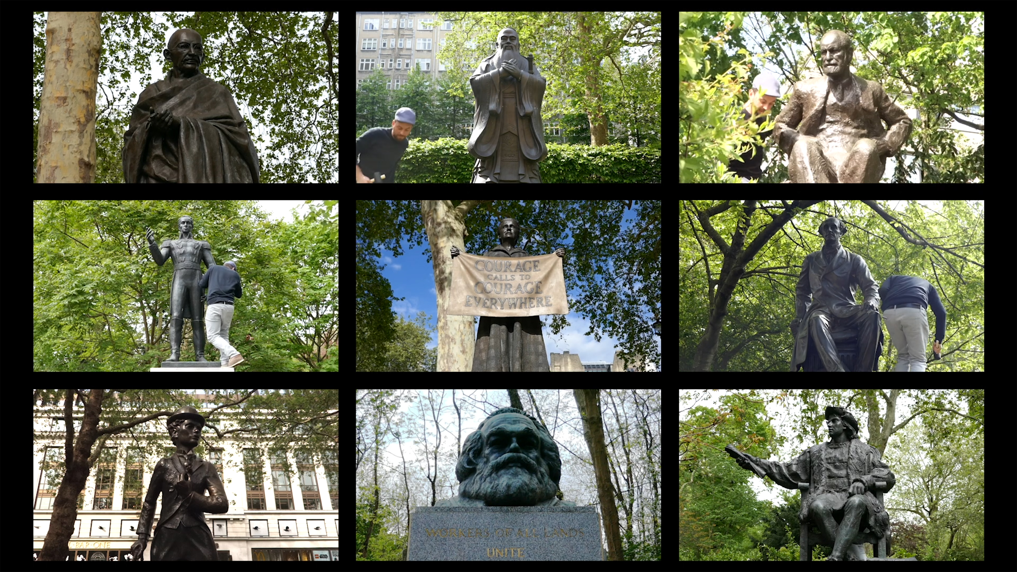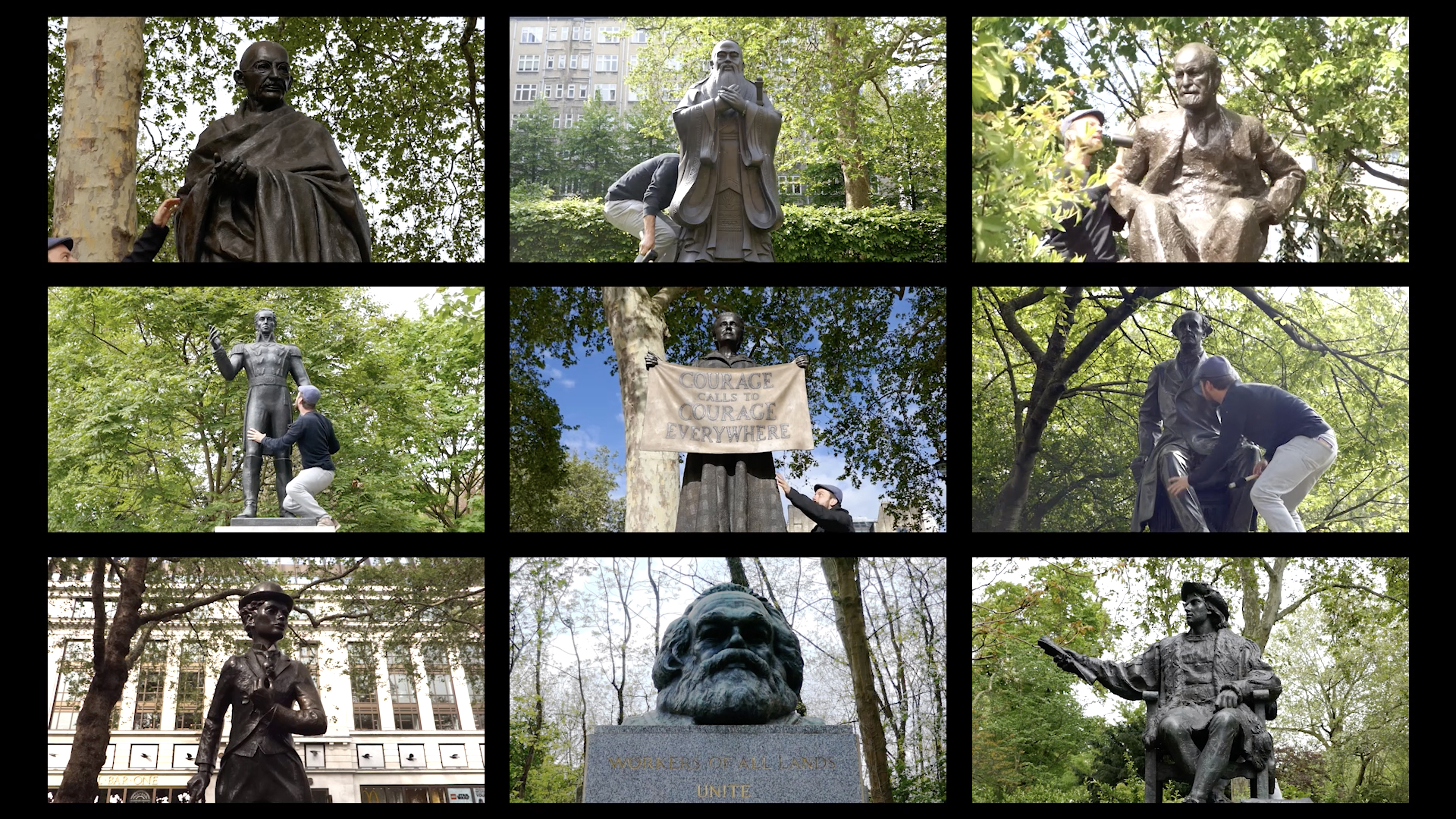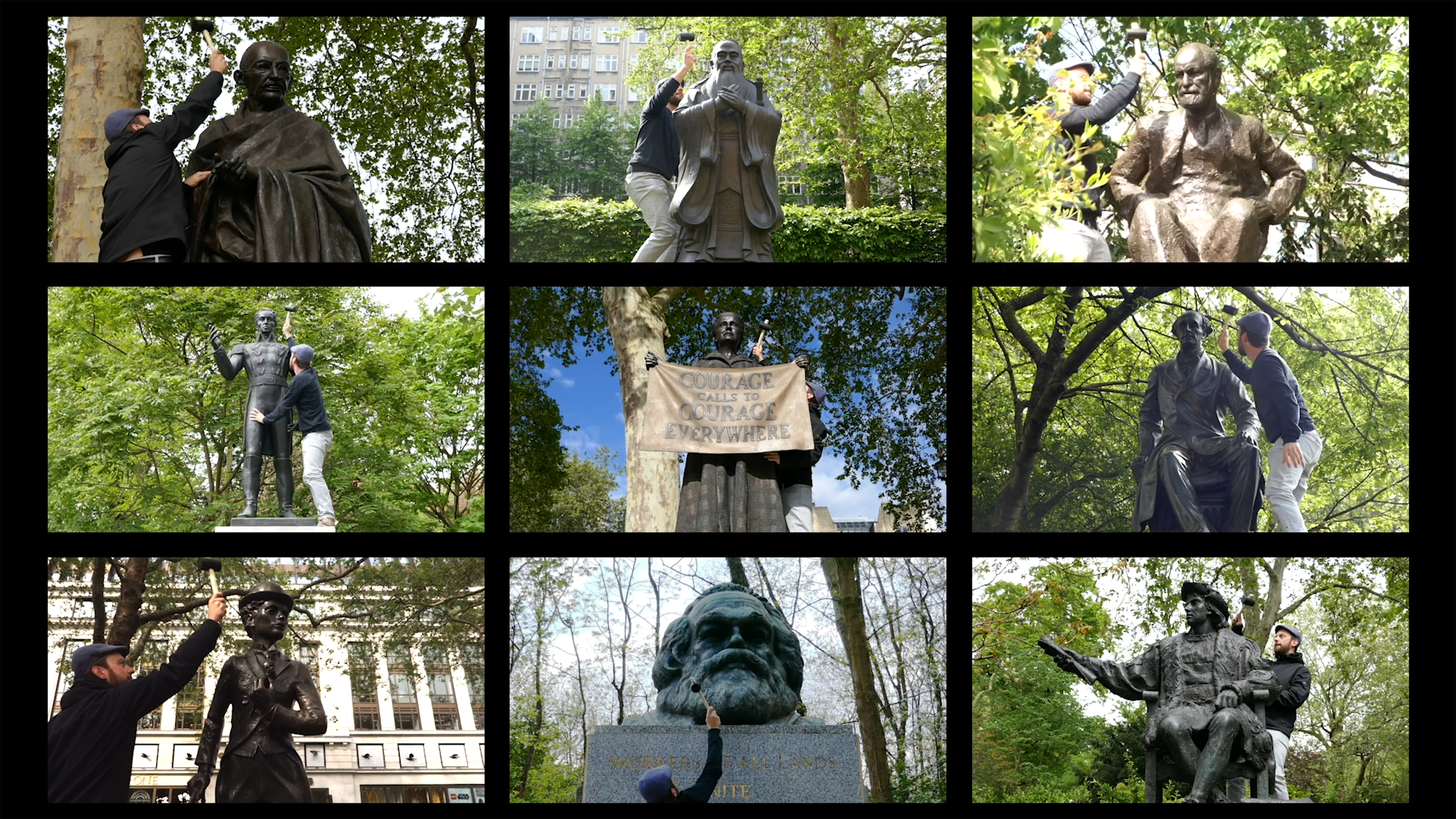 In HARD-HEADED HARMONY nine bronze statutes in London of historic figures ranging from Marx to Charles Chaplin are arranged on a single screen; Heindl climbs them all to create a synchronised tone with a hammer.