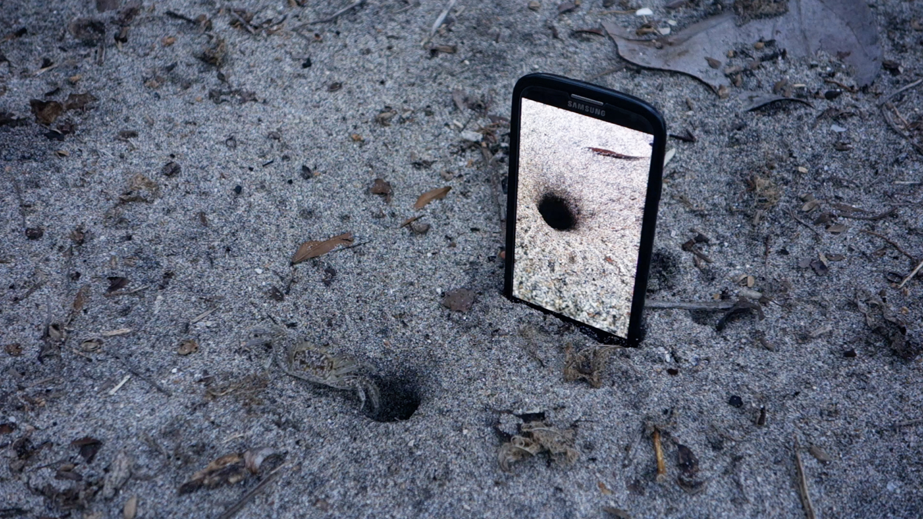 In In Times of Deception Heindl stages several small and nasty deceptive maneuvers. Among other things, a crab is seen crawling into hiding the moment a digital display in the sand presents the image of a fellow crab, or Heindl uses a laser pointer to manipulate cats in a parking garage who appear to be led on an invisible leash. (Christa Benzer)