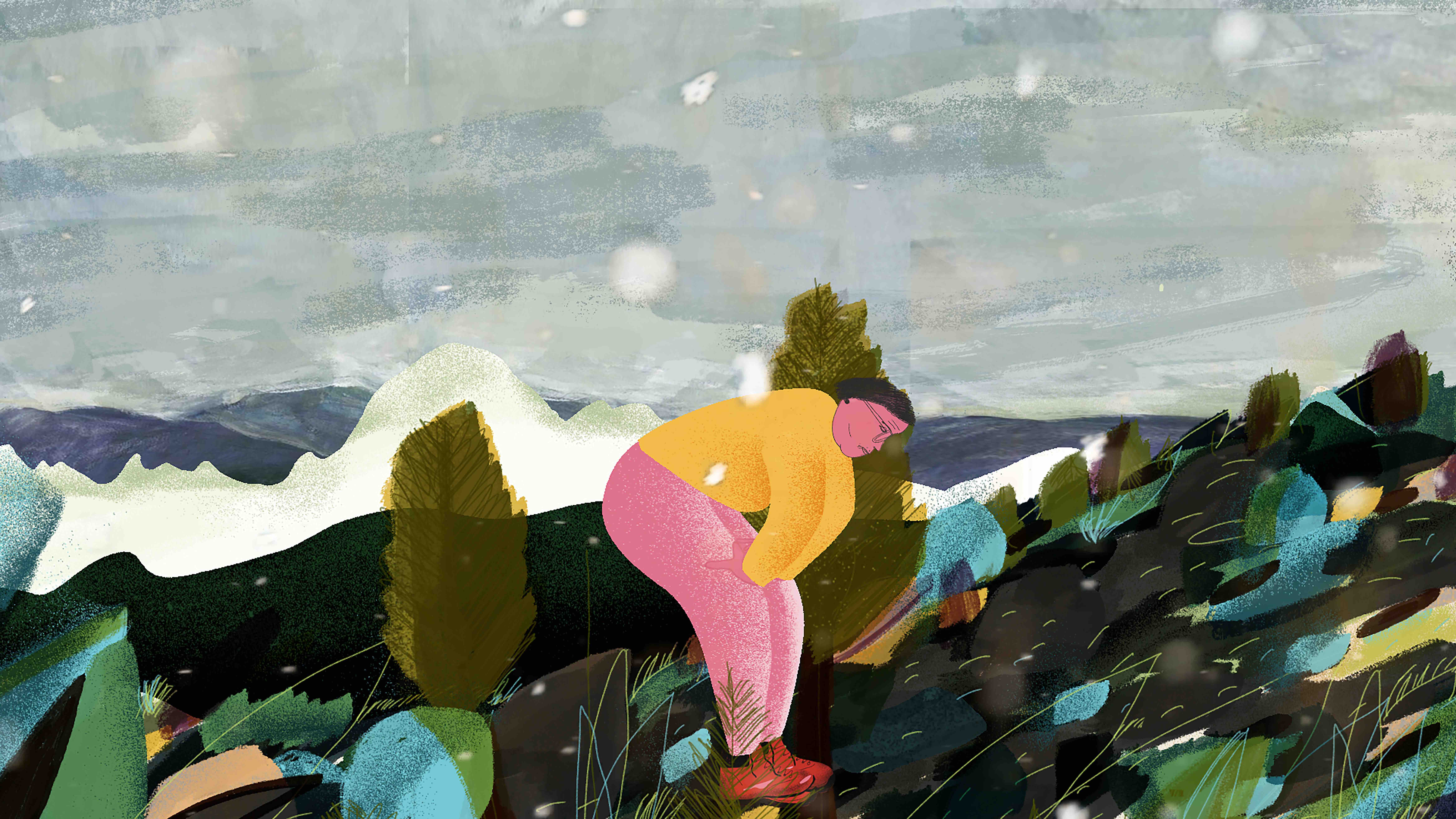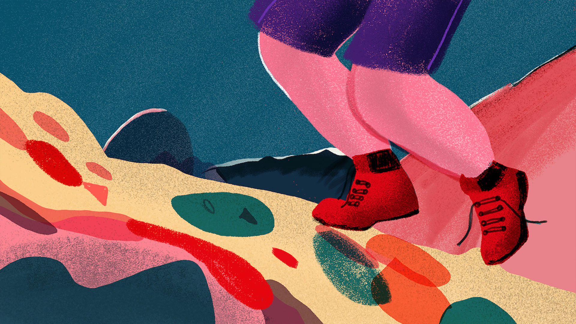 In Her Boots is drawn with flat, voluminous shapes and grounded by a quirky humor paired with a regional sensibility. In the wake of her bleak The Woman Who Turns Into A Castle (2018), it is already the second work by the filmmaker that views sickness from the inside out. In contrast to her former film concerned with a woman afflicted by Encephalitis Lethargica, here suffering fades into the background. In this autobiographically inspired film, Steinbacher instead mobilizes the redemptive and thoroughly creative potential of cognitive displacement: the significantly "red shoes" here play a literally leading role. Hedi continually rediscovers herself in the mountains as a young woman bursting with energy, climbing the highest peaks with ease, her boots ever serving as a loyal companion. When a neighbor at one point alerts Hedi to her worn out old boots and thereby incidentally signals the precarious proximity of welfare and social control, it is no coincidence that a view of the village opens through the eyelets of Hedi's hiking boots. (Esther Buss)