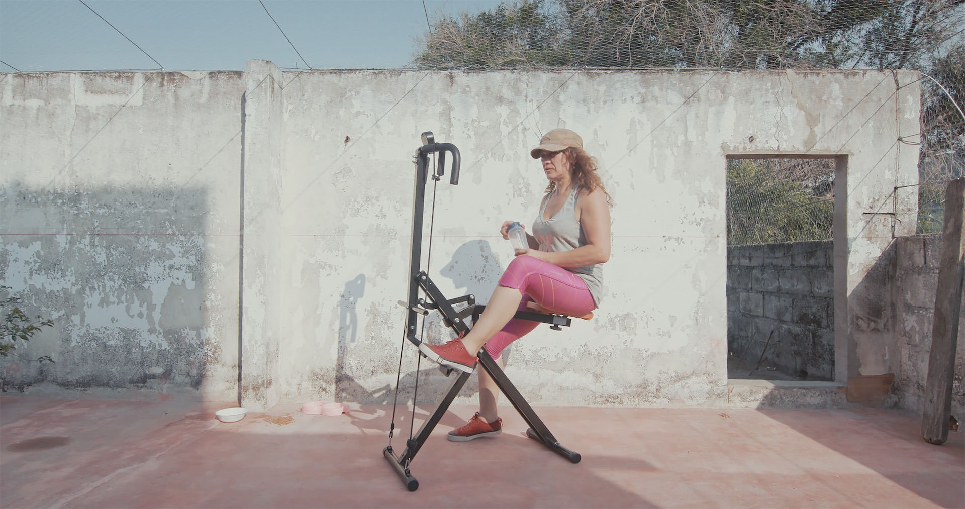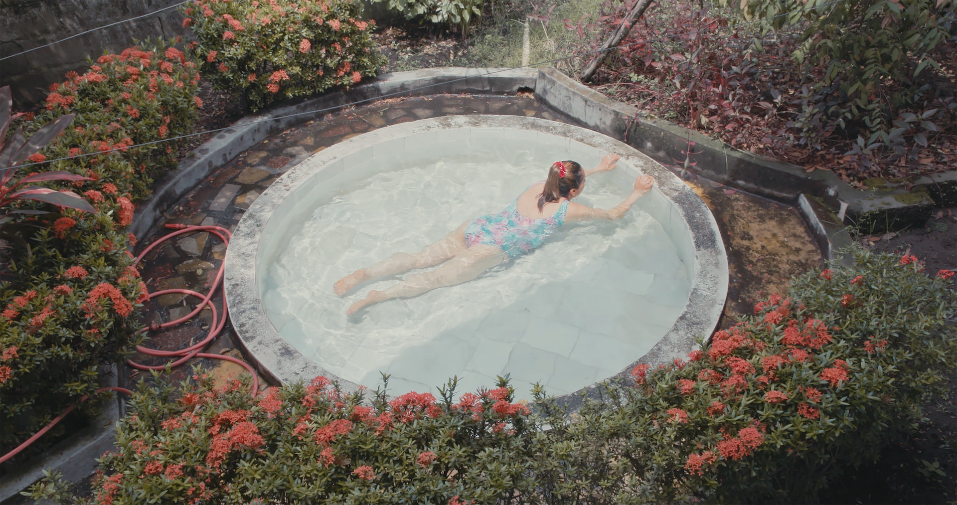 The soil eater. A history made tangible, circumscribed by furnishings, colors, textiles, peopled by protagonists who appear and disappear. The child's feet stride barefoot across the floor, her long white gown trailing fleeting traces in its wake. Whispers, snatches of music. Spheres of domesticity and personal hygiene – and over and over again, the Communion dress in a blue light, illuminated like the virgin Mary. A woman paddles in a round cement pool. She describes an attempt to gain entry to Germany via the Frankfurt airport, the general suspicion raised against her and her Colombian fellow travelers. Another young woman sleeps in a big bed aglow with the sheen of satin sheets, between pastel-violet, ruffled pillows – a giant Santa Biblia keeps watch. Glaringly colorful flip-flops on a shining white polished floor, a leopard-skin patterned dress, a vibrant turquoise house wall, hanging flowers and succulents. A nightly walk to a cow. The taste of soil is ever new. (Madeleine Bernstorff)