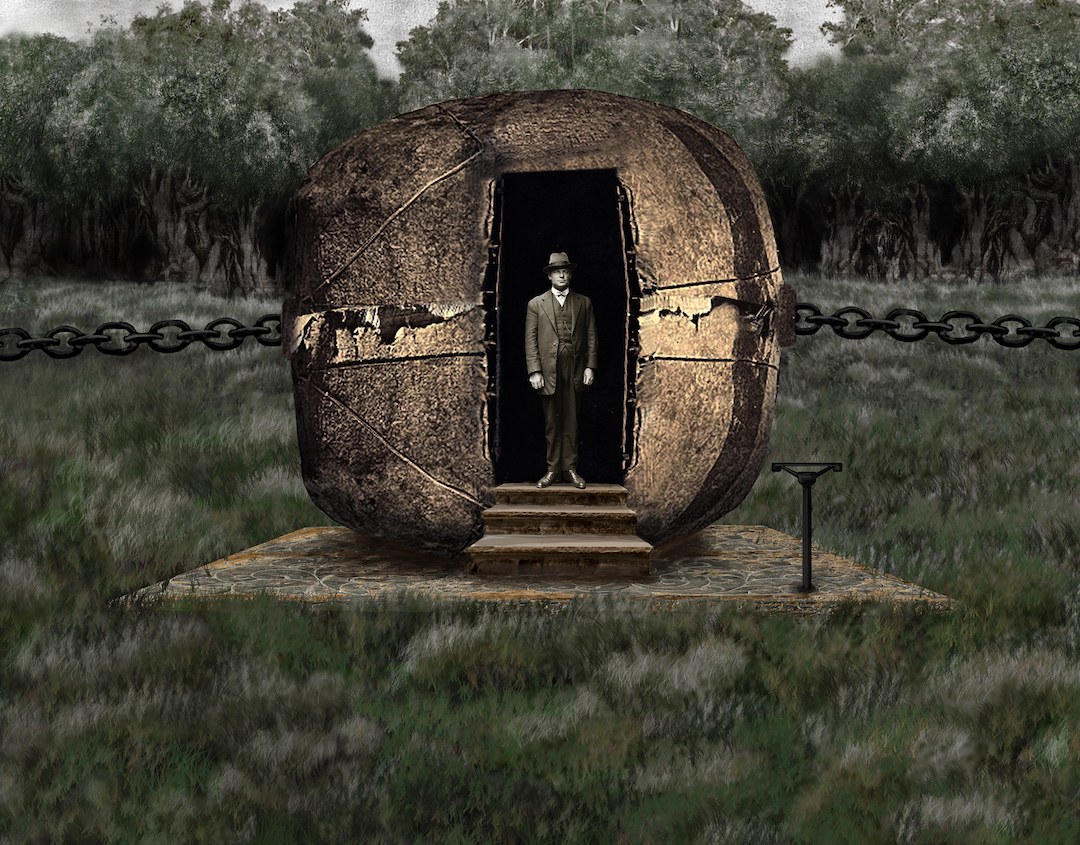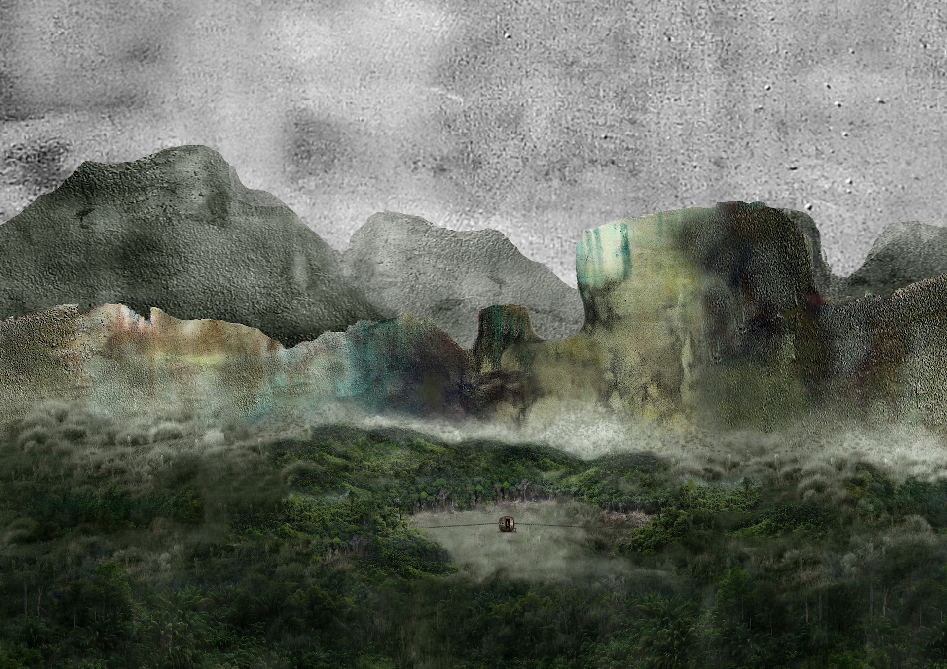 Scene two: An ocean soundscape is heard but there is no water in sight, just a lushly drawn forest and green field of grass gently rolling, in stark contrast to the weighty aquarelle sky of the first scene. This time around, the cube is a spherically shaped bunker from which the next person emerges, to lower a lever depriving the world of electricity. Blood and darkness spread out over a broad landscape where the cube of an electrical outlet is transformed into a small sugar cube in a teacup, gently stirred in a calm circular motion by a silver spoon. The prospect is presented of possibly incorporating a condensed world, albeit constituted by total disorder.