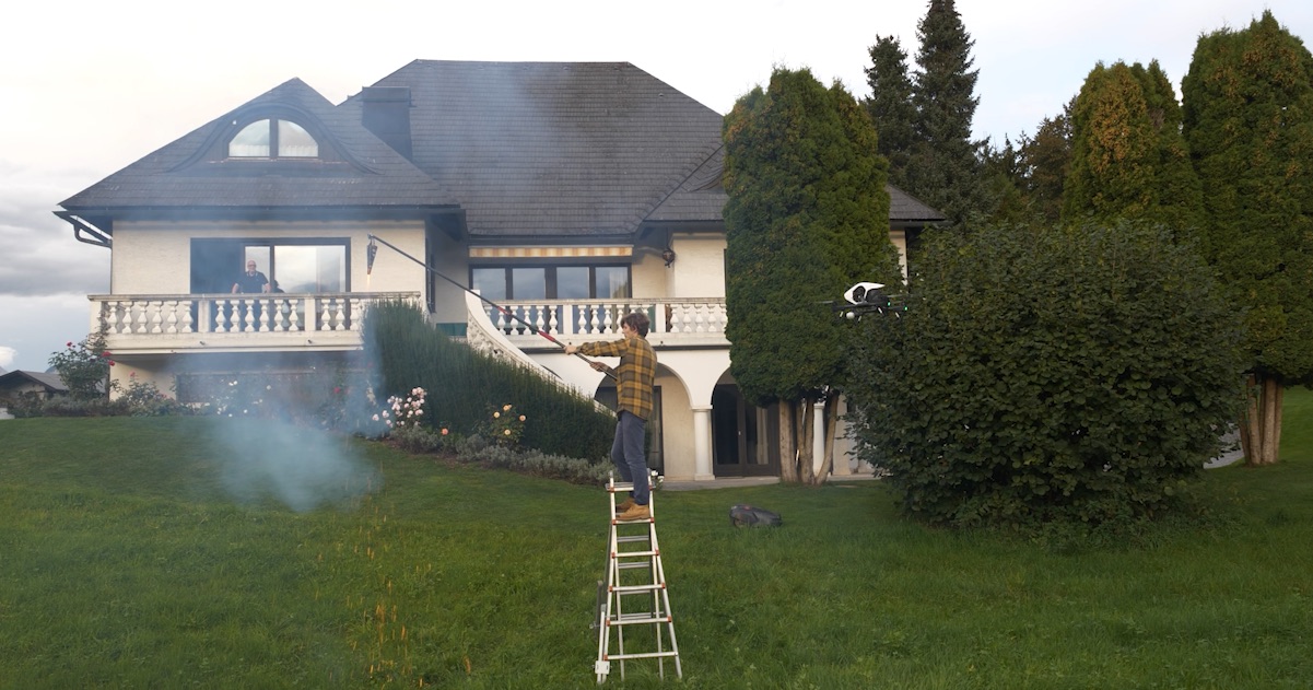 A mansion, a lawn, some trees: an unmoved frontal view, 9 minutes long. We hear an off-screen voice: co-director Lukas Marxt commands/directs what goes on in the image. He calls up participants in a remote-controlled choreography: a certain "John" and his lawn-mower, remote-controlled by him; a "Mandy" whose drone ("camera 2") hovers above the house; and co-director "Jakub" Vrba, the only on-screen person, who climbs a ladder and holds up a cornetthat emits smoke and sparks.
