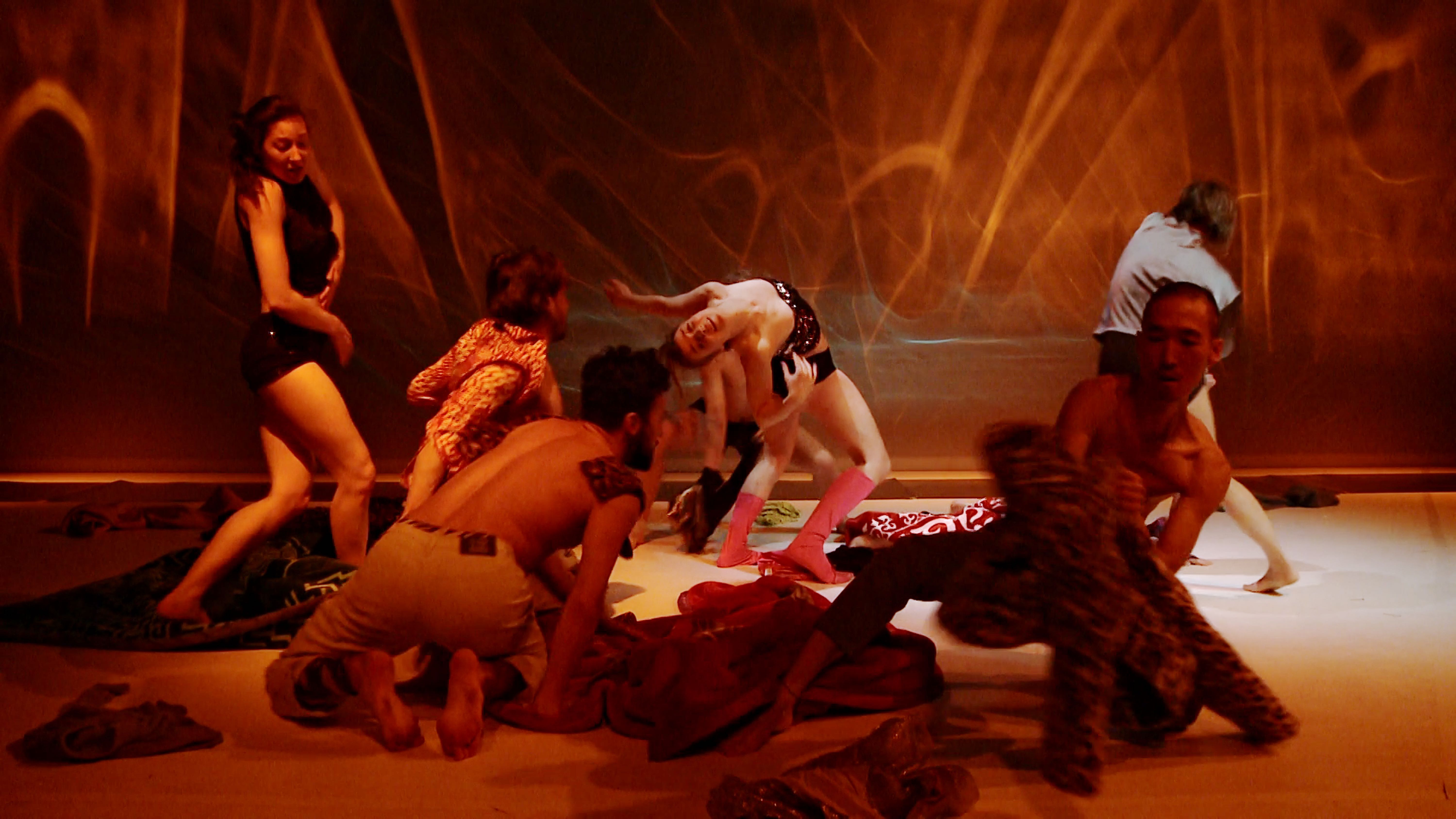 The work, which revolves around body and spirit, extension and contraction, animalistic and artificial intelligence, operates with minimal equipment but in return, radically expands its associative potential. Along with the costumes, the identities fluctuate by the minute, one comes and goes, remains entirely to oneself, and yet in the group, draws invisible signs in the air and on the ground, the body itself is moving script that must first be decoded. Animal-human machines are what appear here, driven by hypnotic music, by trance-like slowed-down songs, which penetrate into the glistening white of the stage scenery, later also into the darkroom atmosphere. Paradise is lost, the strangeness remains. (Stefan Grissemann)
