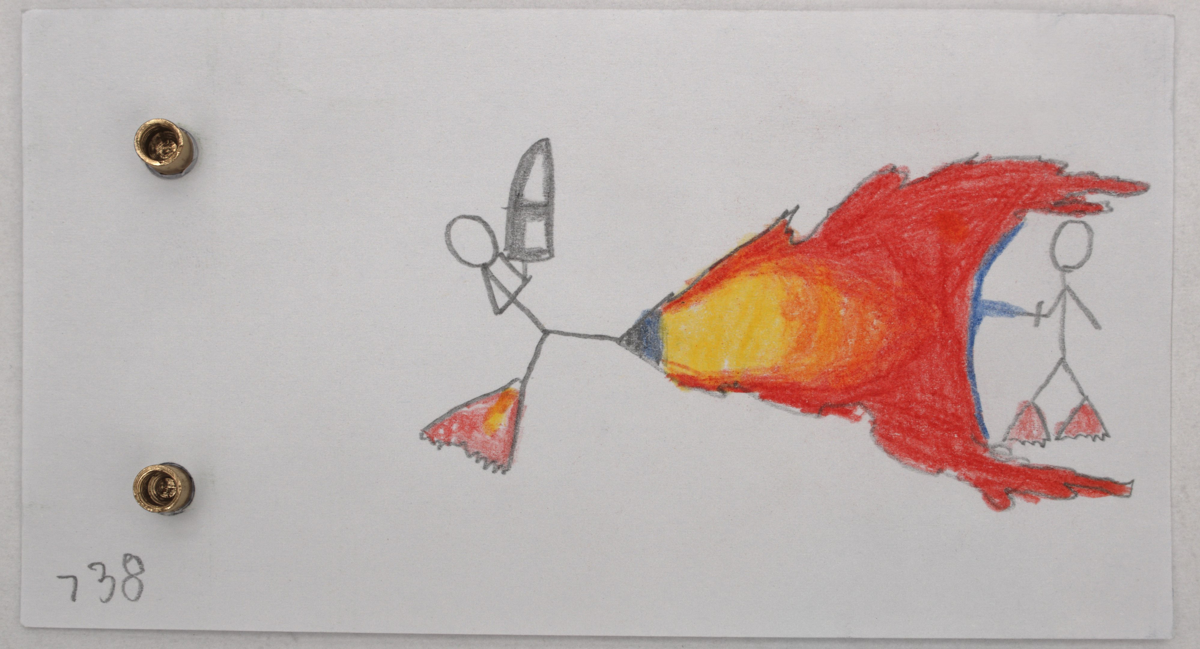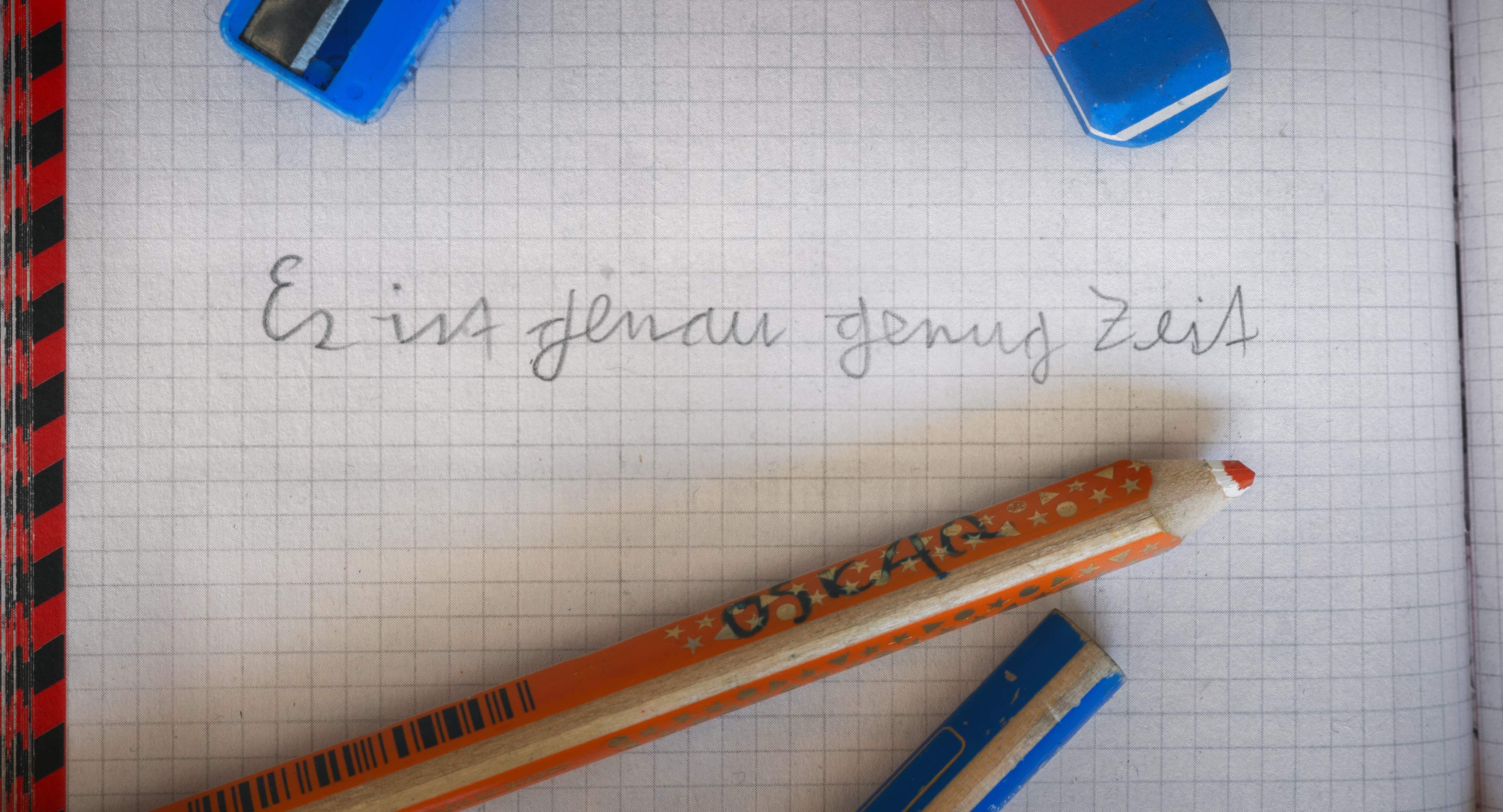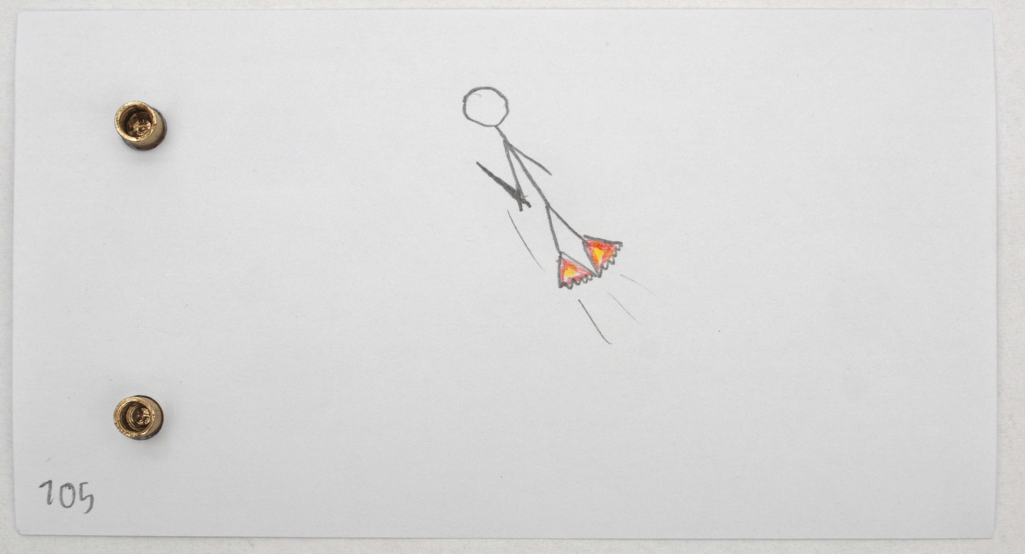 The animation film narrates the dynamic back and forth of a battle between two figures (Red and Blue). The bottom left-hand margin shows penciled page numbers ticking off like a timer. At page 206, the film shifts back to a live-action sequence. A hand puts a new page in place, the second illustrator takes over. The drawing style changes. The page numbers initially continue going up, but soon run backwards to end at a dramatically charged zero. Did Red have just enough time to save himself? Reality answers without mercy. In closing, the work space is seen, this time with two pencils – that of father and son. The name "Oskar" can be read on the red pencil. A collaboration by father and son. How infinitely hard this labor of mourning must have been. (Birgit Flos)